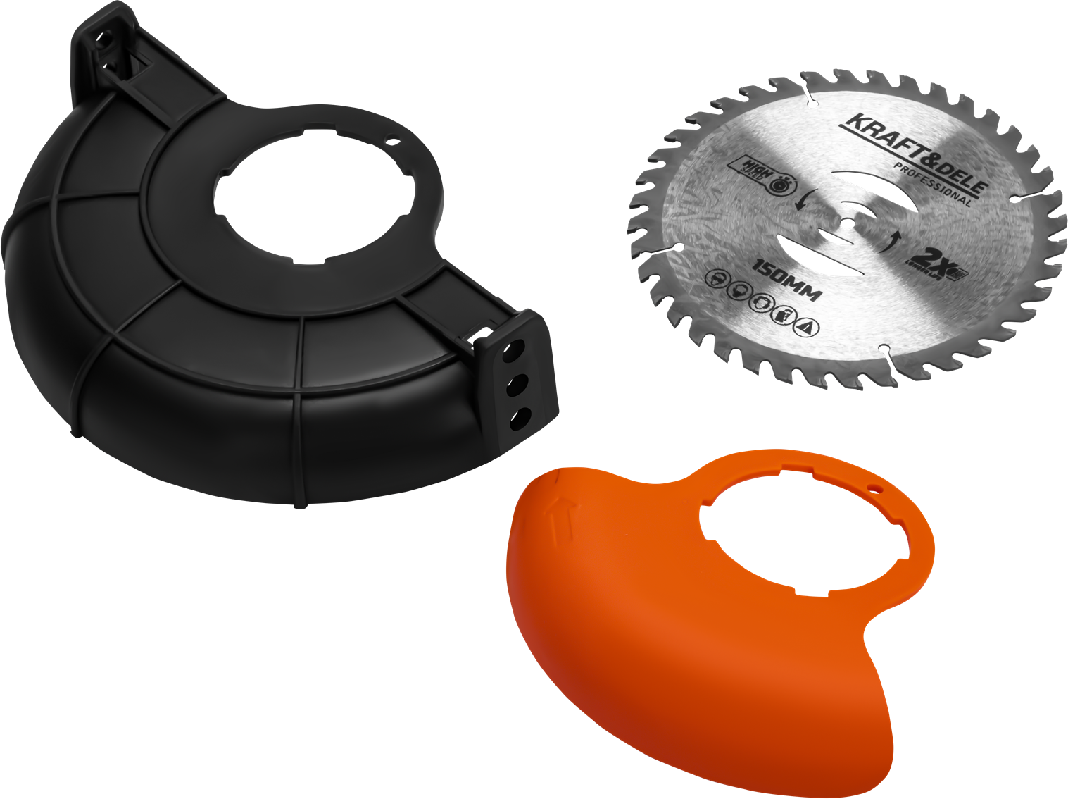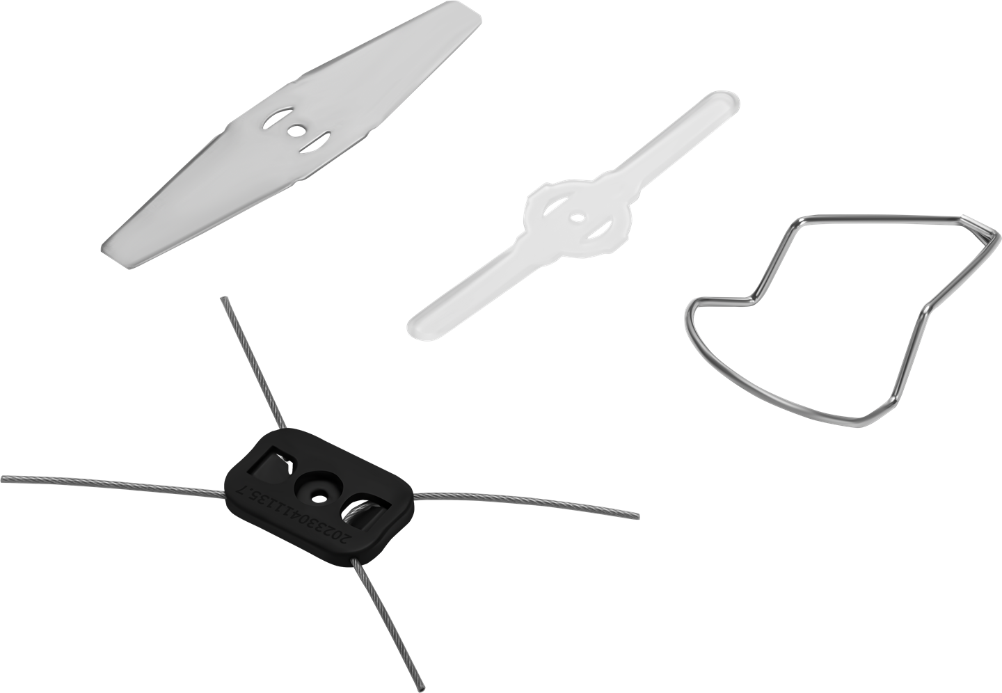 Zestaw zawiera żyłkę, noże metalowe, noże plastikowe oraz tarczę tnącą. Dobór odpowiedniego elementu tnącego zależy od rodzaju roślinności: żyłka sprawdza się przy miękkich trawach, noże metalowe przy twardszej roślinności i chwastach, tarcza przy gęstych zaroślach.