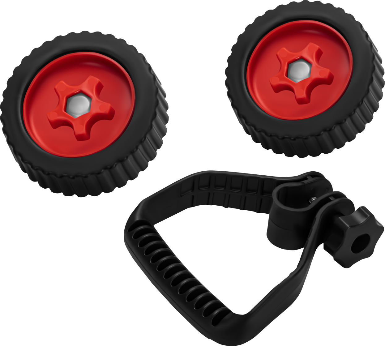 Kółka prowadzące stabilizują urządzenie podczas pracy i pozwalają na równomierne prowadzenie wzdłuż krawędzi trawnika — podobnie jak w przypadku standardowej kosiarki. Osłona robocza chroni głowicę przy pracy w pobliżu twardych przeszkód, takich jak krawężniki czy podmurówki.