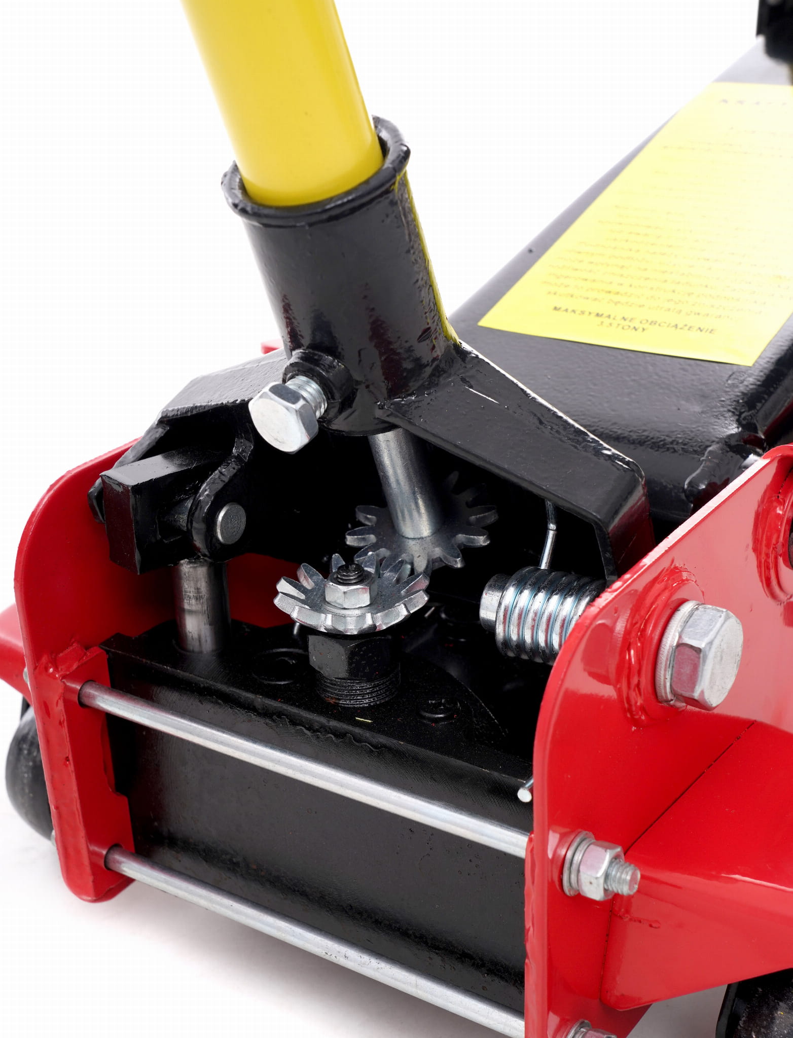 Stalowe koła osi przedniej zapewniają stabilność podczas pracy, natomiast łożyskowane koła skrętne osi tylnej umożliwiają swobodne manewrowanie podnośnikiem — również z obciążeniem. Obrotowa podstawa ułatwia precyzyjne ustawienie pod punktem podparcia.