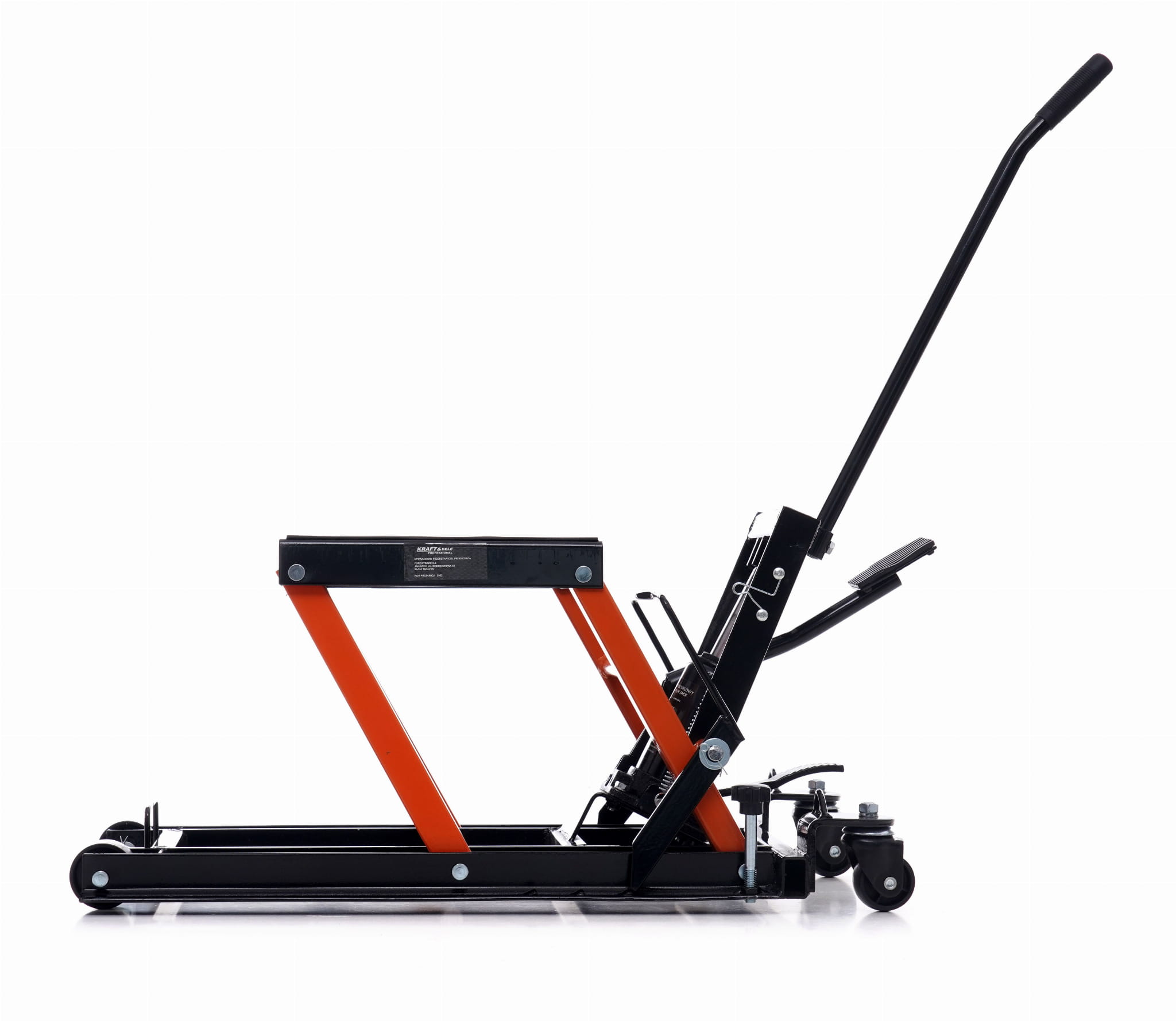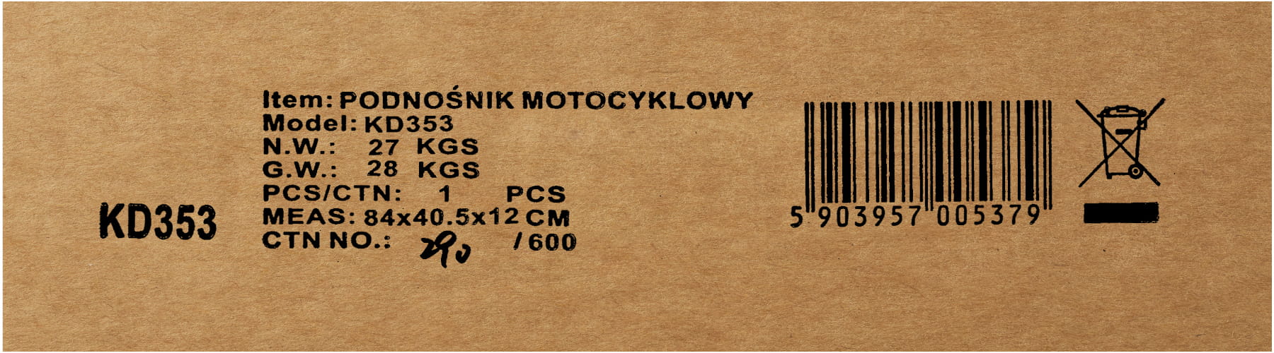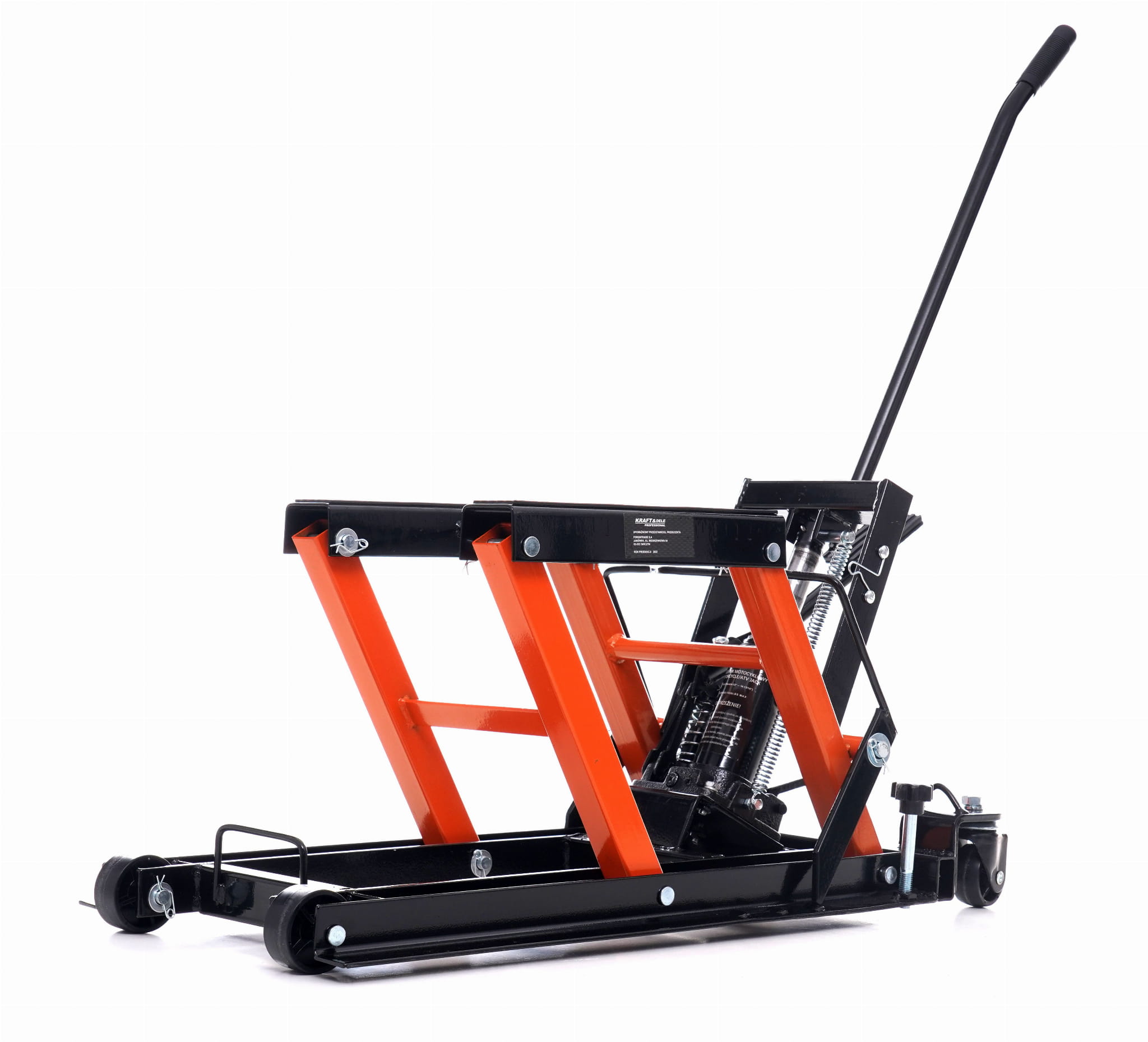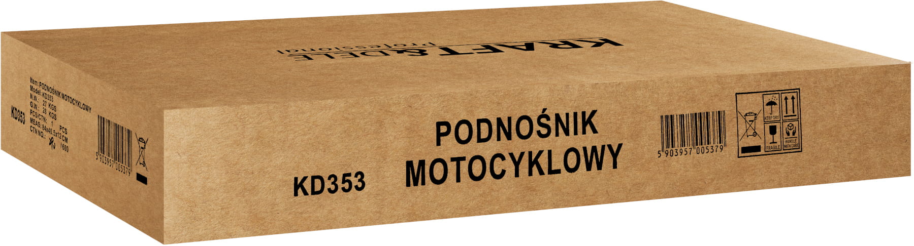 KD353 to hydrauliczny podnośnik platformowy przeznaczony do unoszenia motocykli, quadów i innych pojazdów ATV o masie do 500 kg. Stalowa, lakierowana proszkowo rama z antypoślizgowymi wspornikami gumowymi zapewnia stabilne podparcie pojazdu podczas prac serwisowych i konserwacyjnych.
