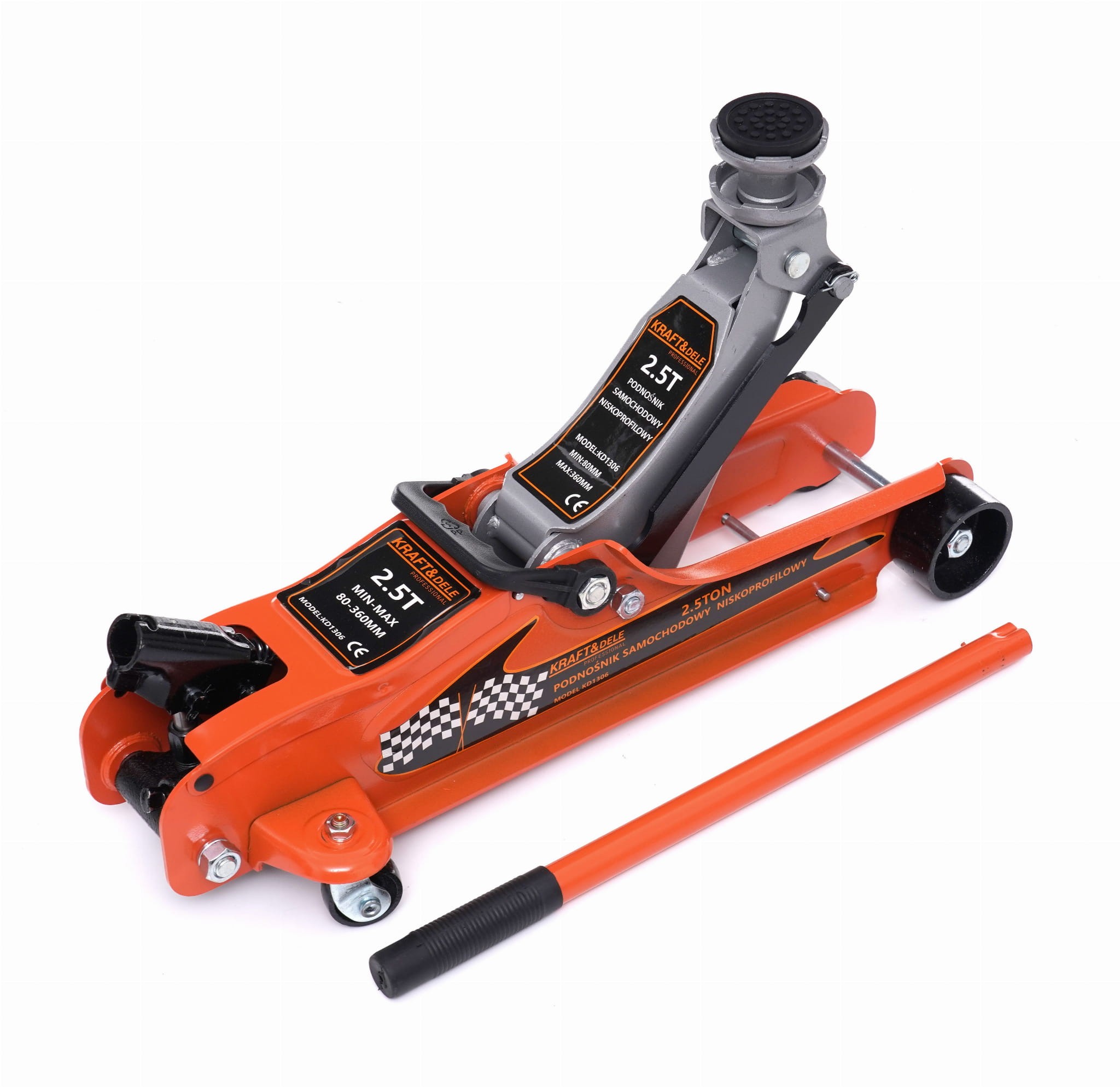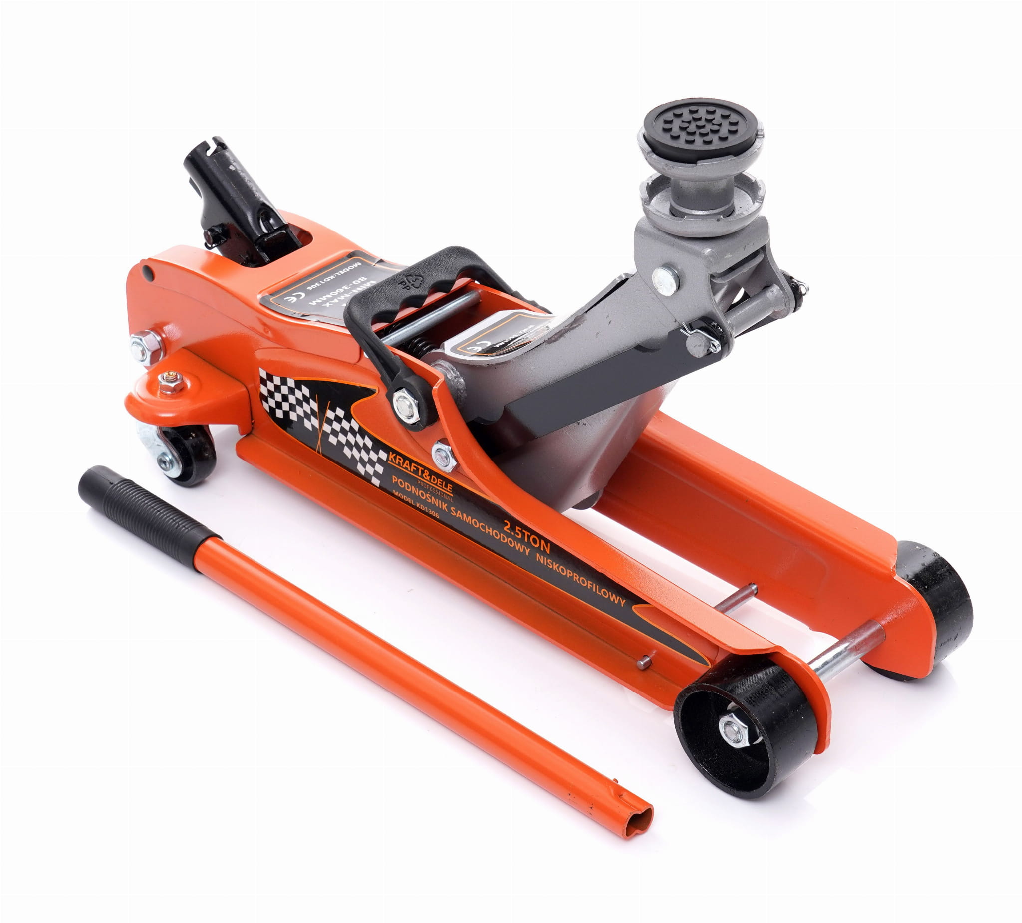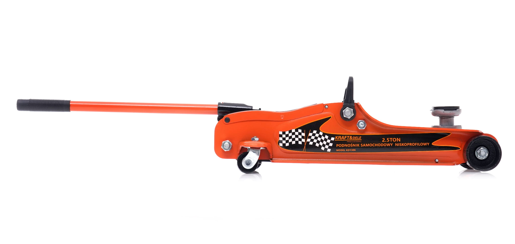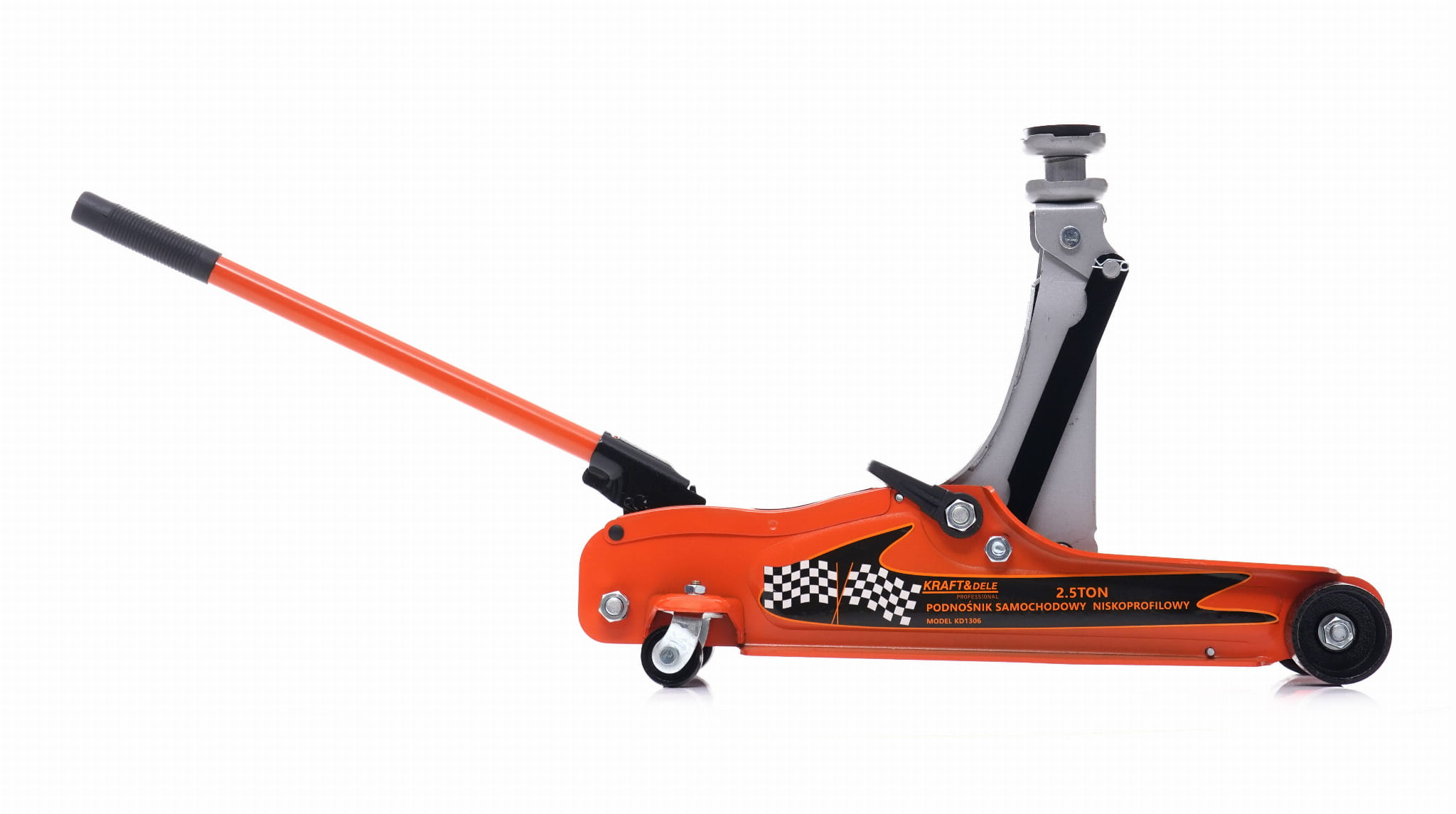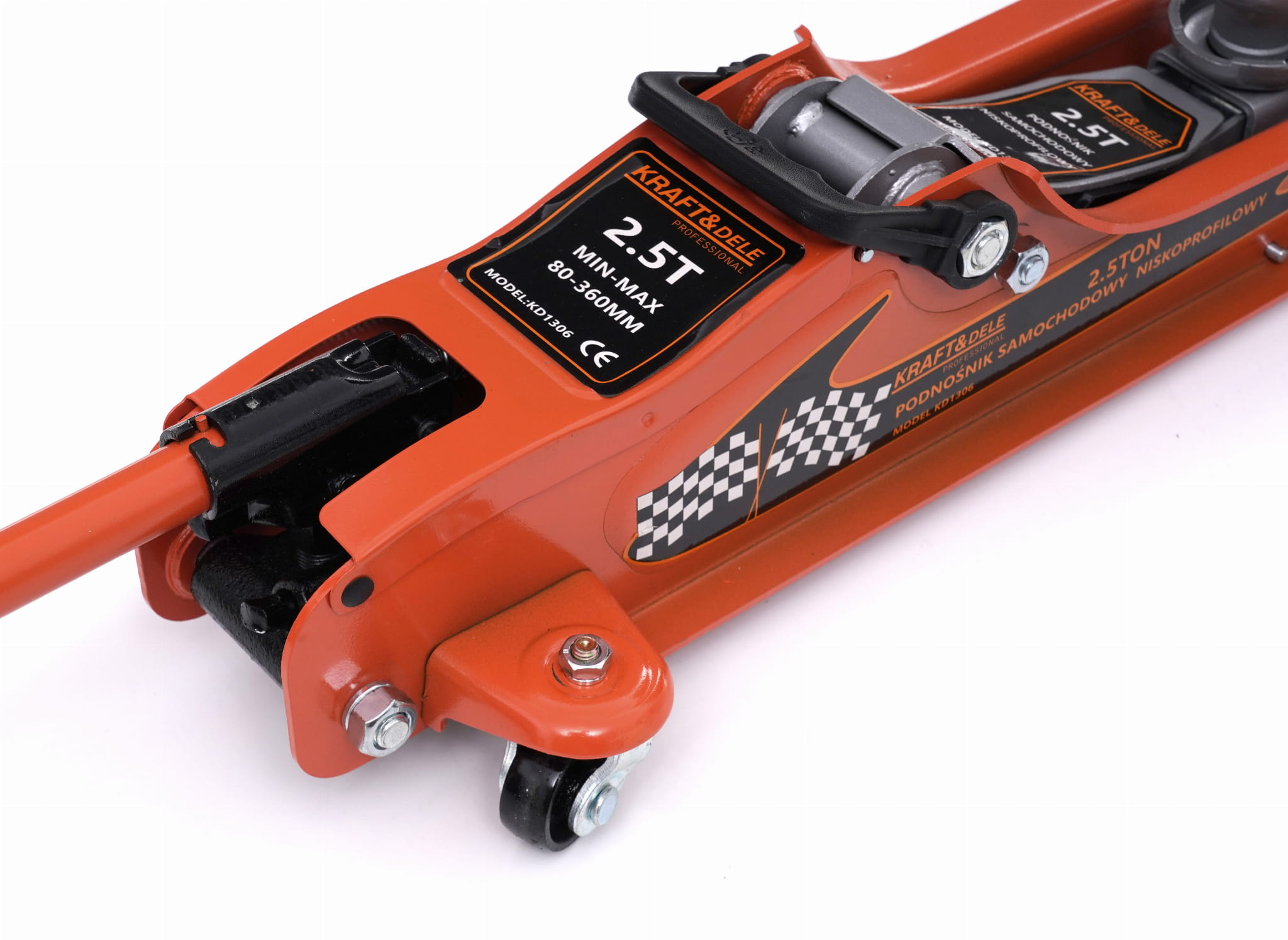 Hydrauliczny podnośnik samochodowy typu żaba o udźwigu 2500 kg, przeznaczony do pojazdów o niskim prześwicie. Minimalna wysokość robocza wynosząca 80 mm umożliwia podważenie nawet nisko zawieszonych aut osobowych i sportowych, gdzie standardowe podnośniki nie mogą być zastosowane.