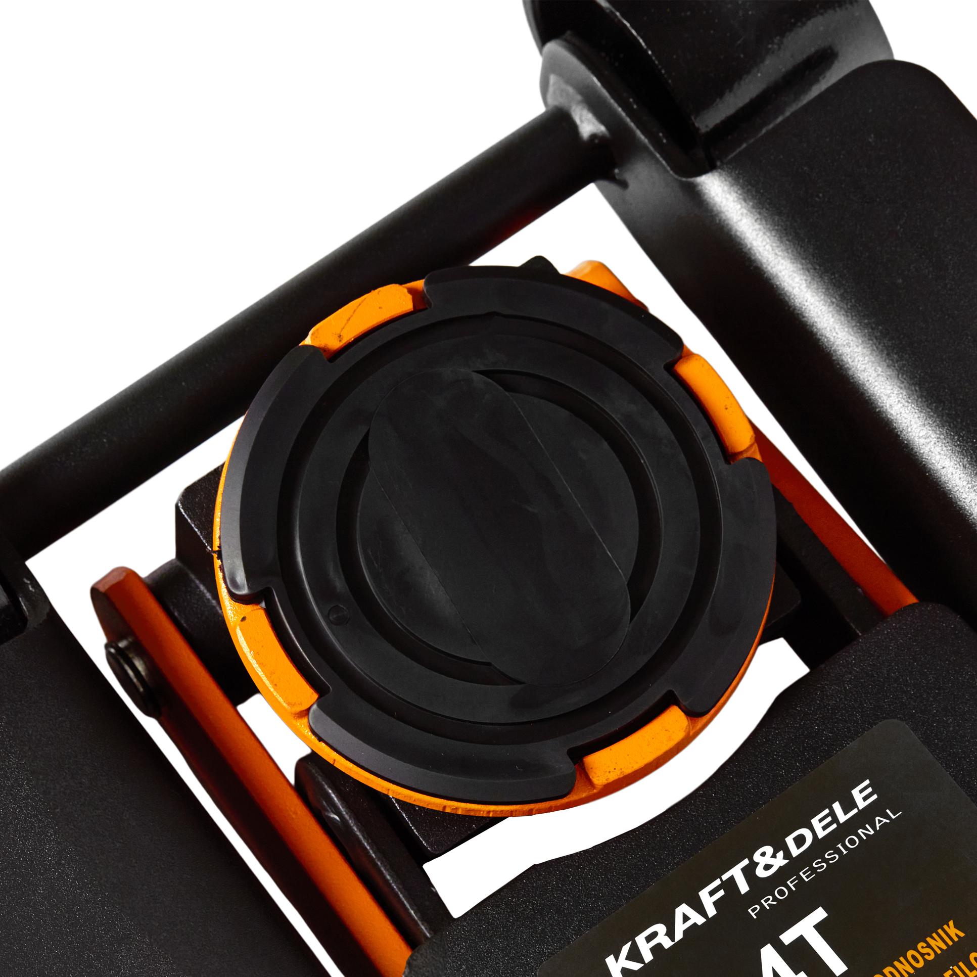 Przed użyciem należy zmierzyć prześwit pojazdu — odległość między podłożem a najniżej położonym punktem podwozia. Wartość ta musi być większa niż 95 mm (minimalna wysokość podnośnika w złożeniu). Punkt podparcia (próg nośny, belka podwozia lub wskazany przez producenta pojazdu punkt serwisowy) powinien wytrzymać obciążenie odpowiadające rzeczywistej masie unoszonej osi. Udźwig podnośnika 4000 kg odnosi się do całkowitego obciążenia — w praktyce przy unoszeniu jednej osi obciążenie stanowi połowę masy pojazdu.