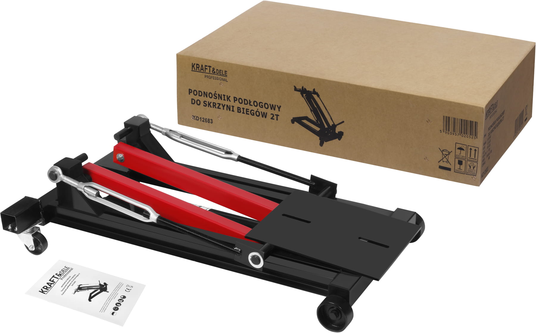 KD12683 to hydrauliczny podnośnik podłogowy przeznaczony do montażu i demontażu skrzyń biegów, przekładni różnicowych oraz innych ciężkich elementów układu napędowego. Stalowa konstrukcja ramowa współpracuje z jednokierunkową pompą hydrauliczną, zapewniając kontrolowane podnoszenie w zakresie 225–900 mm.