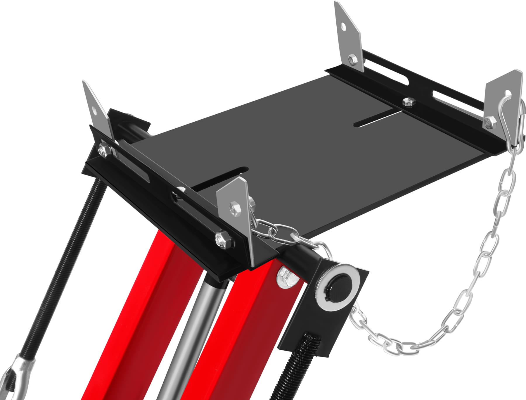 Zestaw regulowanych uchwytów wraz z łańcuchem mocującym pozwala na pewne unieruchomienie skrzyni biegów na płycie montażowej. Zabezpieczenie przed przesunięciem lub zsunięciem elementu jest niezbędne podczas operacji podnoszenia i pozycjonowania pod pojazdem.