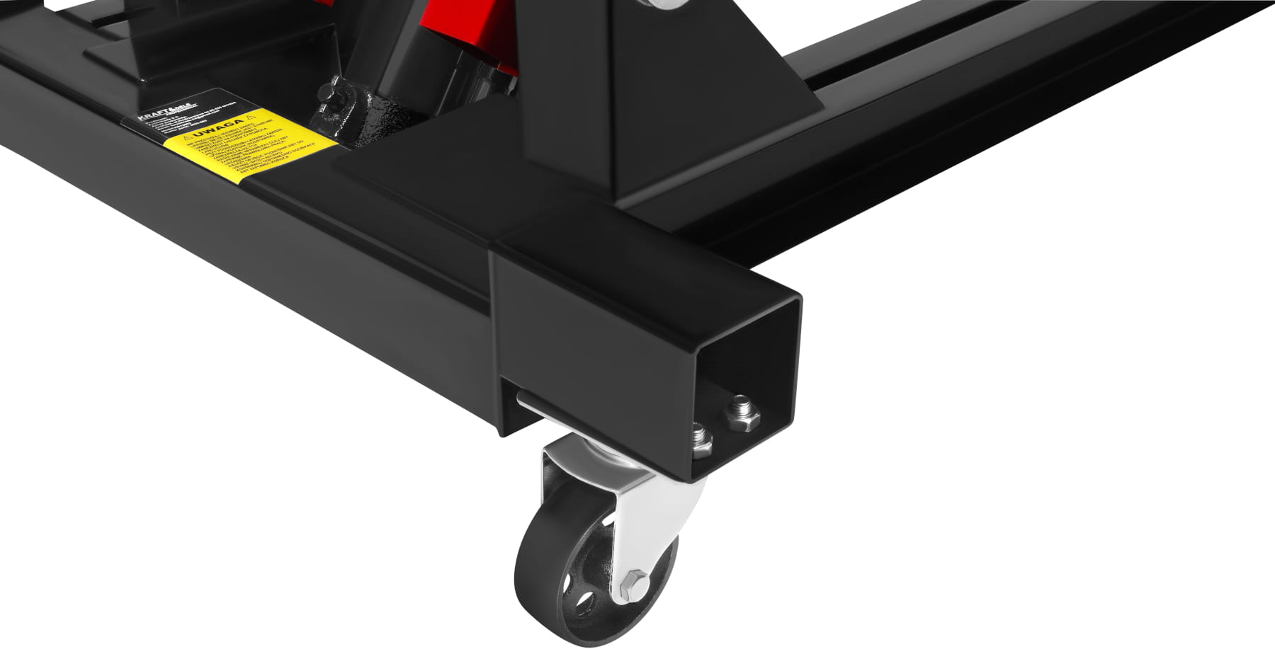 Dwa koła skrętne z przodu i dwa stałe z tyłu umożliwiają swobodne manewrowanie podnośnikiem po posadzce warsztatowej. Taki układ pozwala na precyzyjne naprowadzenie urządzenia pod pojazd bez konieczności jego przestawiania.