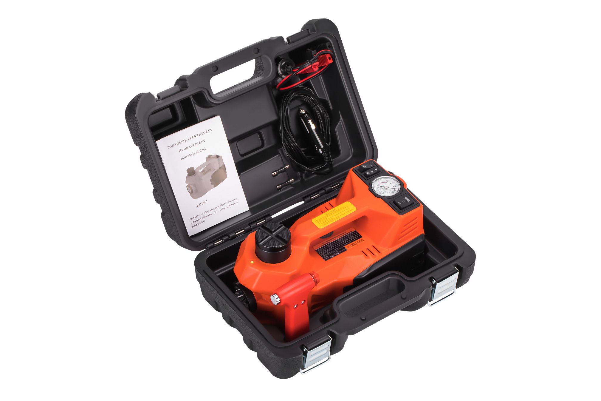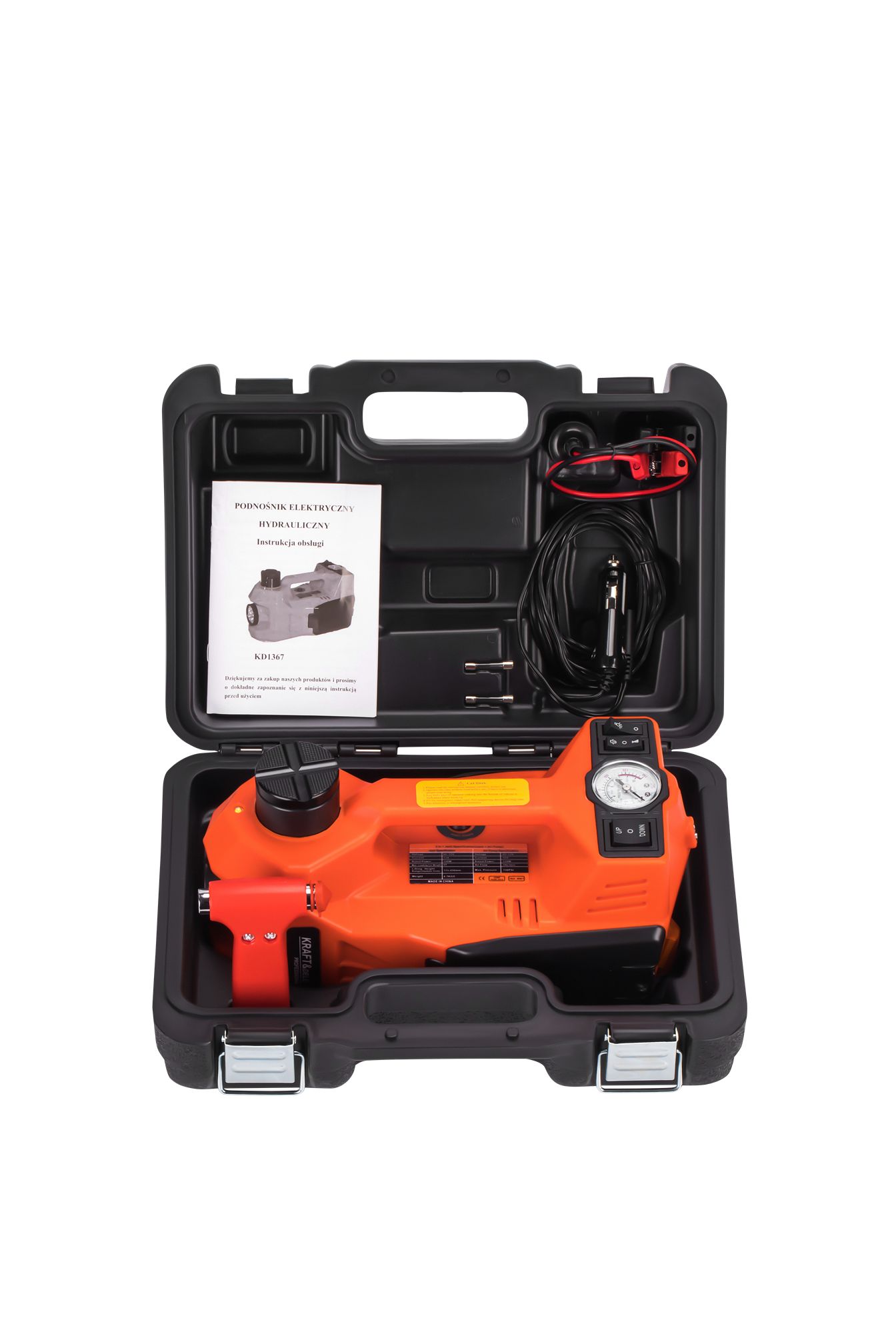 Podnośnik samochodowy elektryczny KD1367 to praktyczne wsparcie przy wymianie koła na drodze i w garażu. Mocny napęd podnosi pojazd bez ręcznego pompowania, a wbudowany kompresor pozwala szybko dopompować oponę i kontrolować ciśnienie na manometrze.