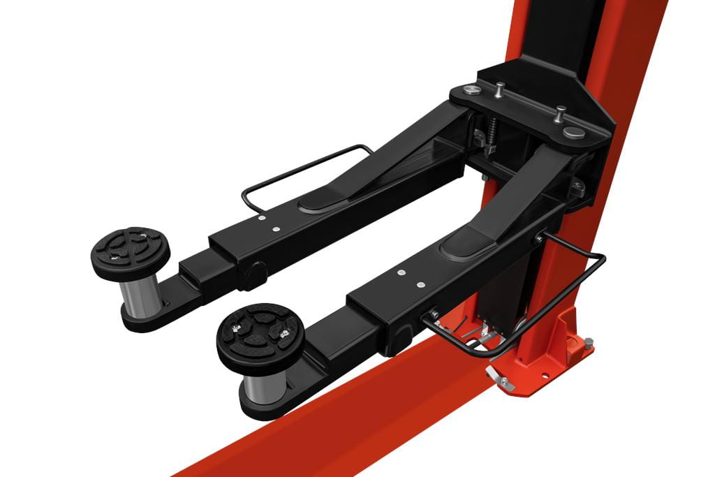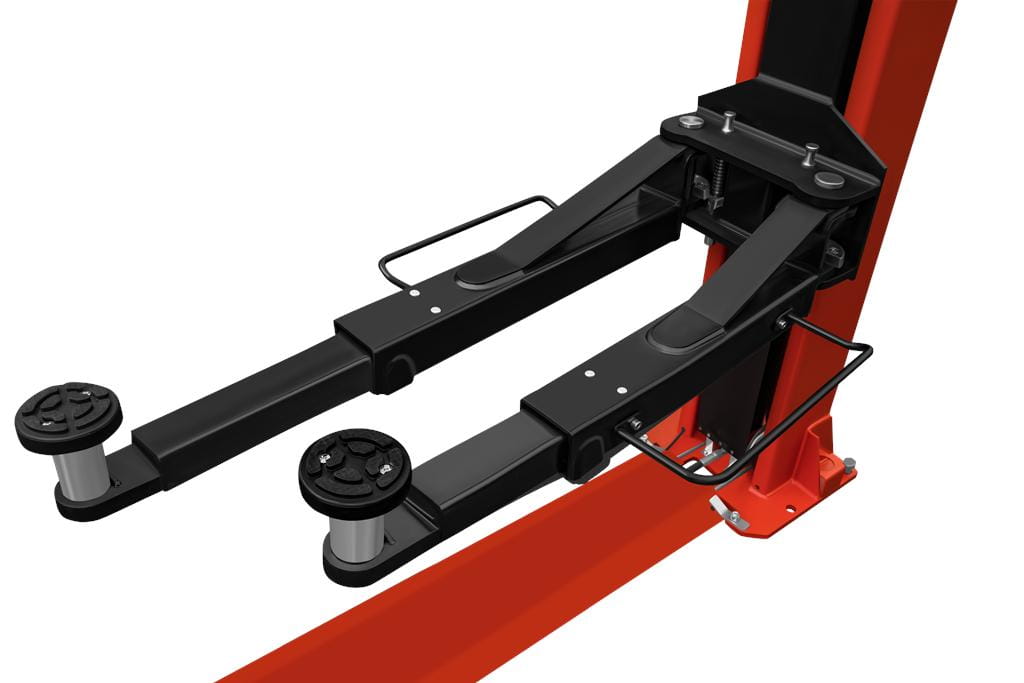 Ramiona o regulowanej długości (900–1400 mm oraz 720–1050 mm) umożliwiają precyzyjne ustawienie punktów podparcia pod progami pojazdu. Układ asymetryczny pozwala na otwarcie drzwi podczas pracy — technik ma swobodny dostęp do wnętrza kabiny bez konieczności opuszczania pojazdu.