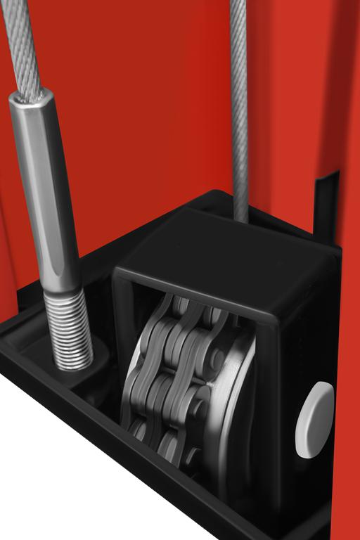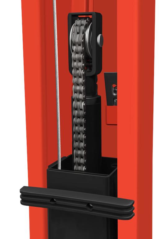 Siła nośna przenoszona jest przez łańcuchy 8-ogniwowe, a nie przez liny stalowe czy pasy. Łańcuchy charakteryzują się wyższą odpornością na zużycie i mniejszą podatnością na nagłe uszkodzenia, co bezpośrednio przekłada się na trwałość i bezpieczeństwo urządzenia w długoterminowej eksploatacji.