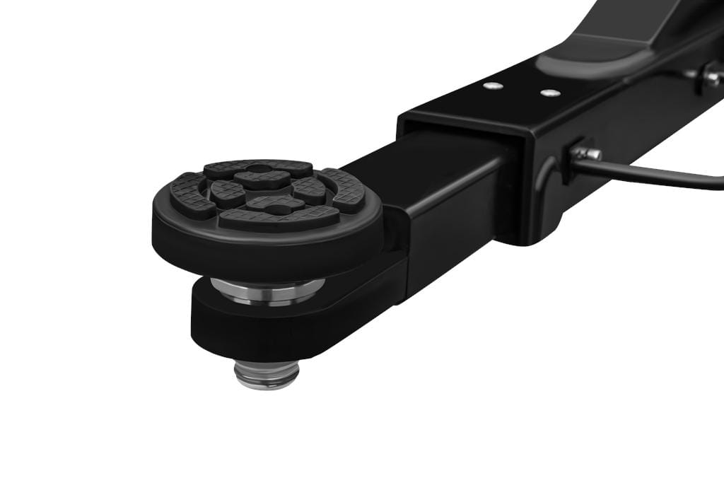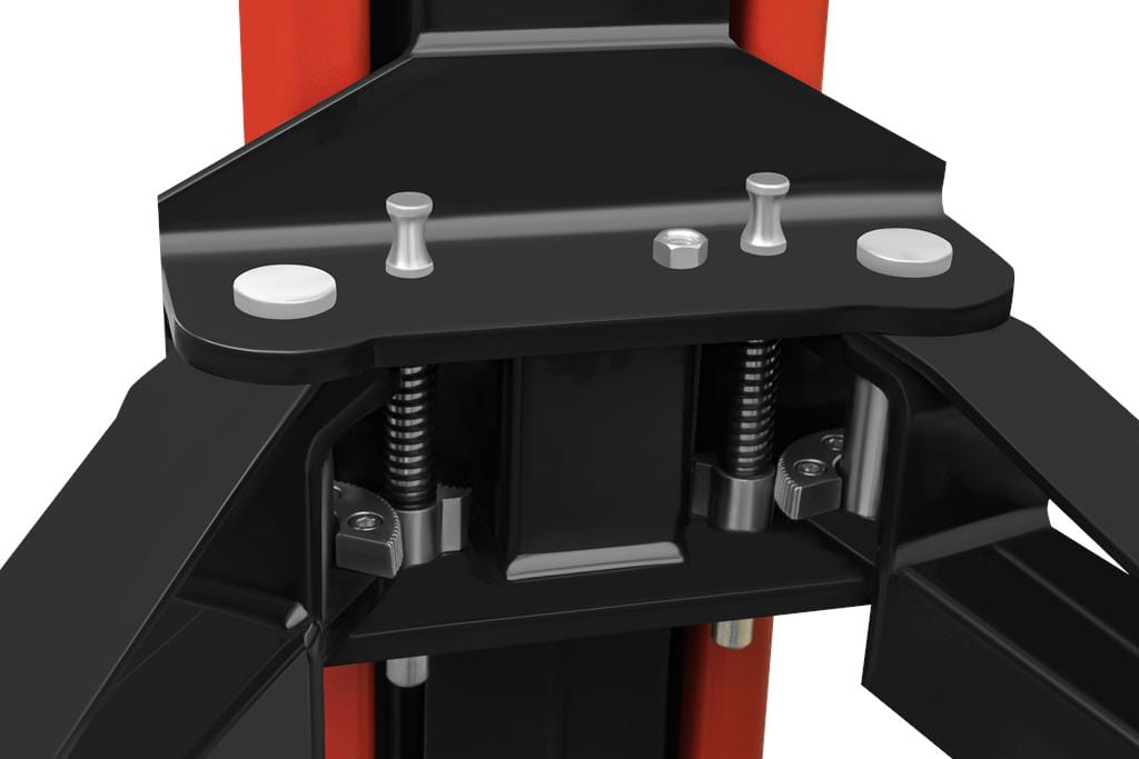 Układ asymetryczny pozwala na odsunięcie słupów od osi pojazdu, co ułatwia otwieranie drzwi podczas pracy. Dwustopniowa budowa ramion oraz regulowana długość (900–1400 mm i 720–1050 mm) umożliwiają dopasowanie punktów podparcia do różnych rozstawów osi i typów nadwozi.