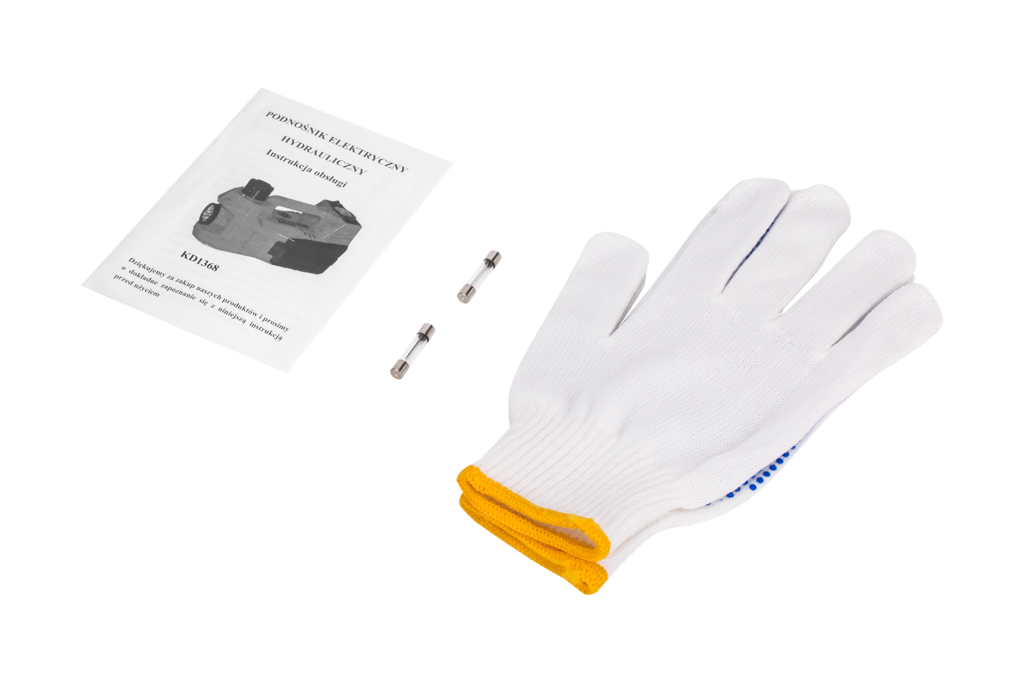 Elektryczny podnośnik hydrauliczny 12V, klucz udarowy 12V z 2 nasadkami dwustronnymi (17/19 mm i 21/23 mm), adapter do akumulatora, klucz imbusowy, 2 bezpieczniki 15A, rękawiczki robocze, młotek bezpieczeństwa do wybijania szyb.