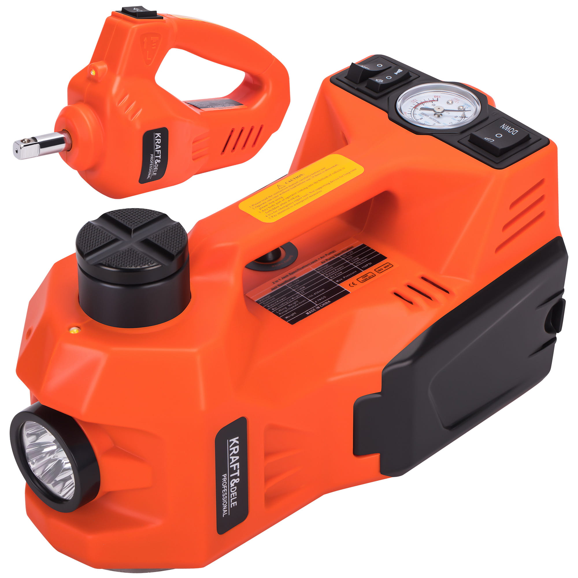 KD1368 to zestaw narzędzi przeznaczony do samodzielnej wymiany koła lub wykonywania prac serwisowych przy pojeździe. W skład zestawu wchodzi elektryczny podnośnik punktowy zasilany napięciem 12V DC z wbudowanym kompresorem, lampą LED i czerwonym światłem ostrzegawczym, a także klucz udarowy z zestawem nasadek. Całość przechowywana jest w walizce transportowej.