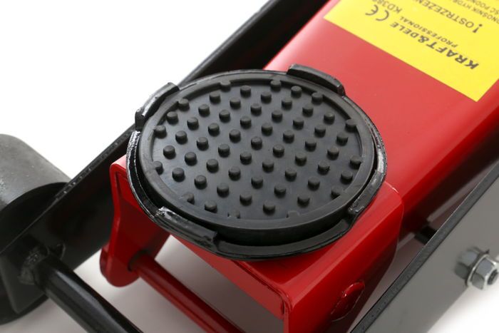 Talerz z możliwością obrotu dostosowuje się do kąta progu lub punktu podparcia pojazdu, co zmniejsza ryzyko zsunięcia się ramienia podczas unoszenia i równomiernie rozkłada nacisk.