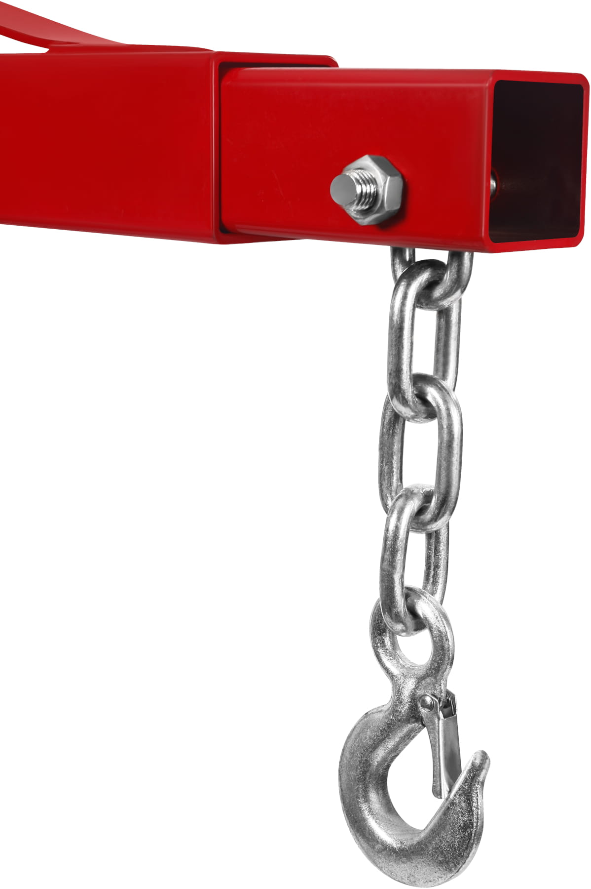 Ramię wysięgnika przestawia się pomiędzy pozycją 700 mm a 1100 mm. Przy krótszym wysięgniku udźwig wynosi 1000 kg, przy dłuższym — 250 kg. Taka zależność wynika z fizyki dźwigni: im większy zasięg, tym mniejszy dopuszczalny ciężar. Możliwość wyboru pozycji pozwala dostosować żuraw do warunków przestrzennych w miejscu pracy.