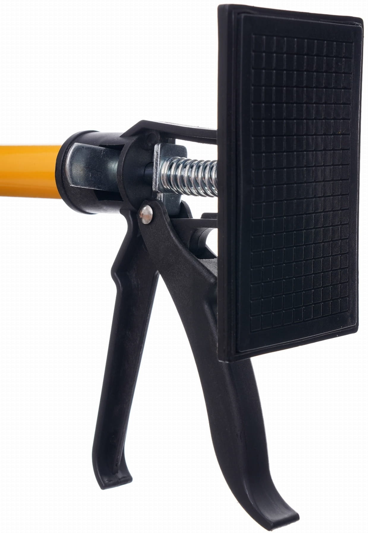 Górna płyta dociskowa może przyjmować różne kąty nachylenia, co umożliwia pewne podparcie płyt montowanych pod kątem — np. przy skośnych sufitach lub w narożnikach. Dwa uchwyty zabezpieczające utrzymują pozycję podpory podczas pracy.