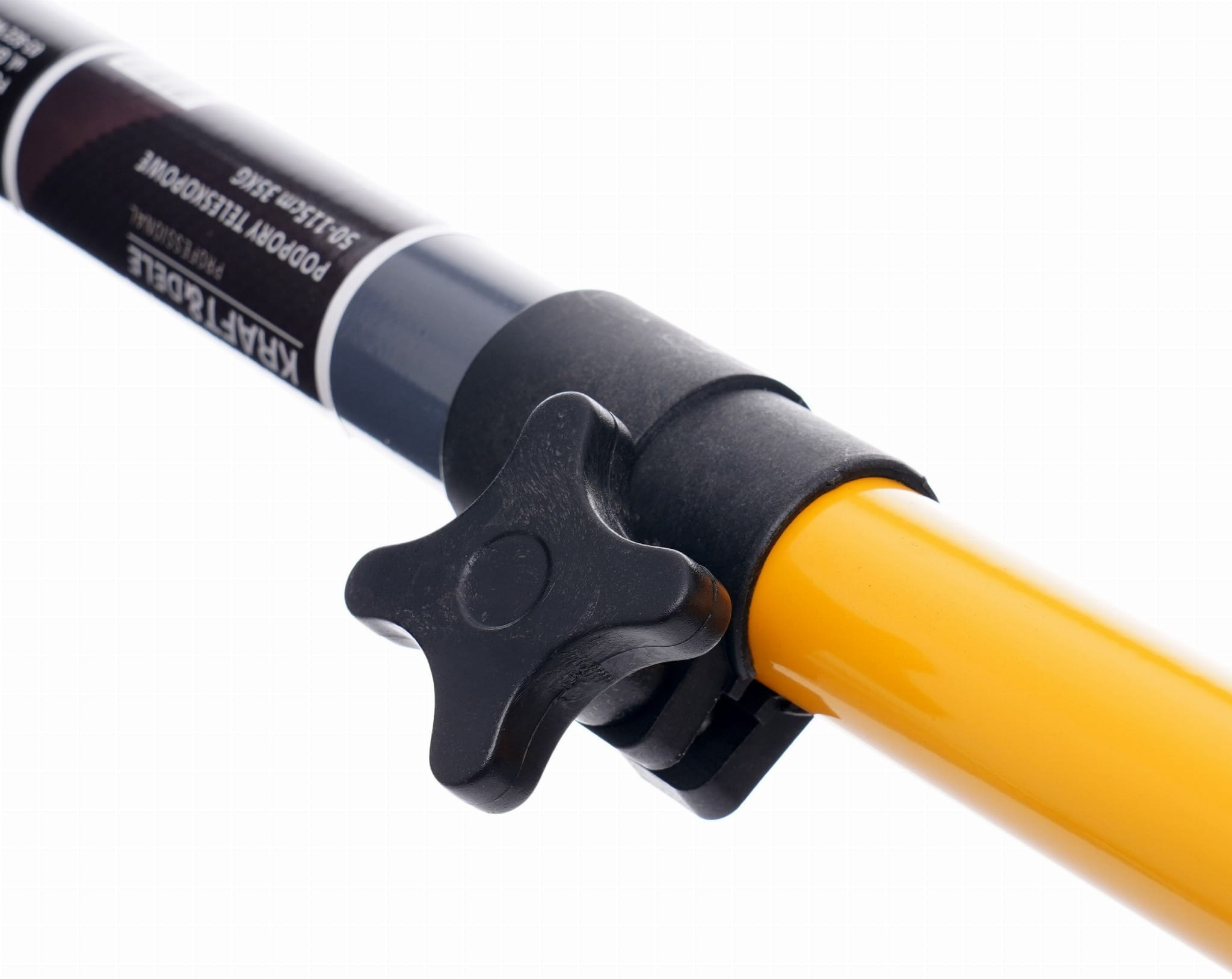 Podpora montażowa z mechanizmem teleskopowym, przeznaczona do podtrzymywania płyt sufitowych i ściennych podczas prac wykończeniowych. Umożliwia pracę na nierównych powierzchniach dzięki uchylnym płytom dociskowym, a zakres regulacji 50–115 cm obejmuje standardowe wysokości robocze w budownictwie mieszkaniowym i komercyjnym.