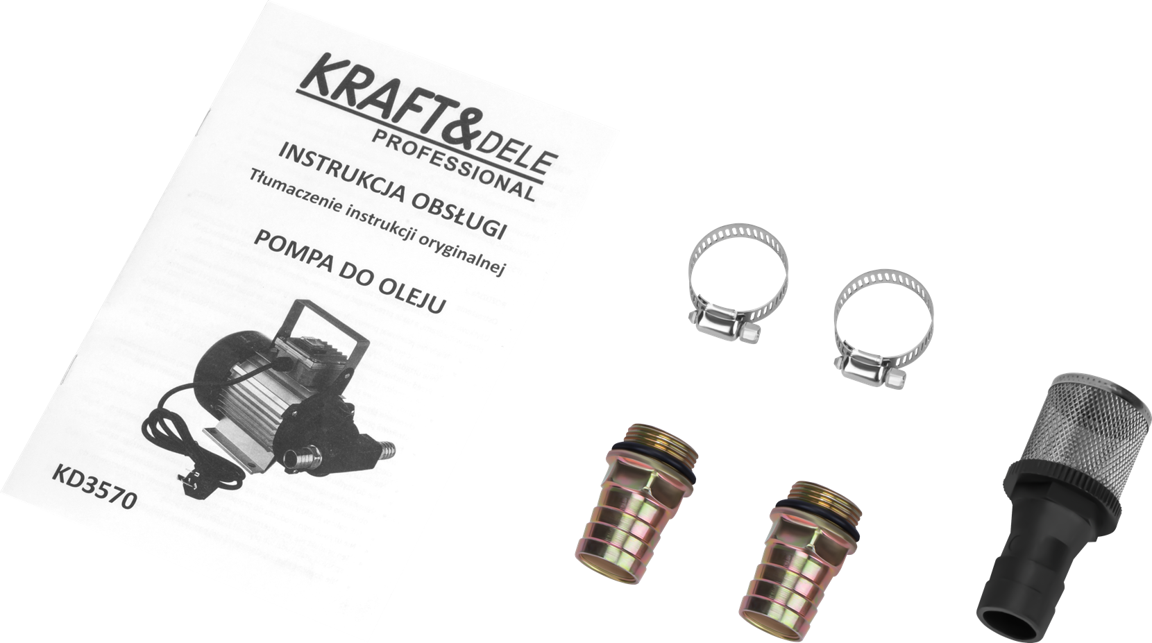 Pompa do oleju KD3570, filtr, 2 opaski zaciskowe, 2 króćce (przyłącze 1"), taśma teflonowa do uszczelnienia połączeń gwintowych, instrukcja obsługi w języku polskim.