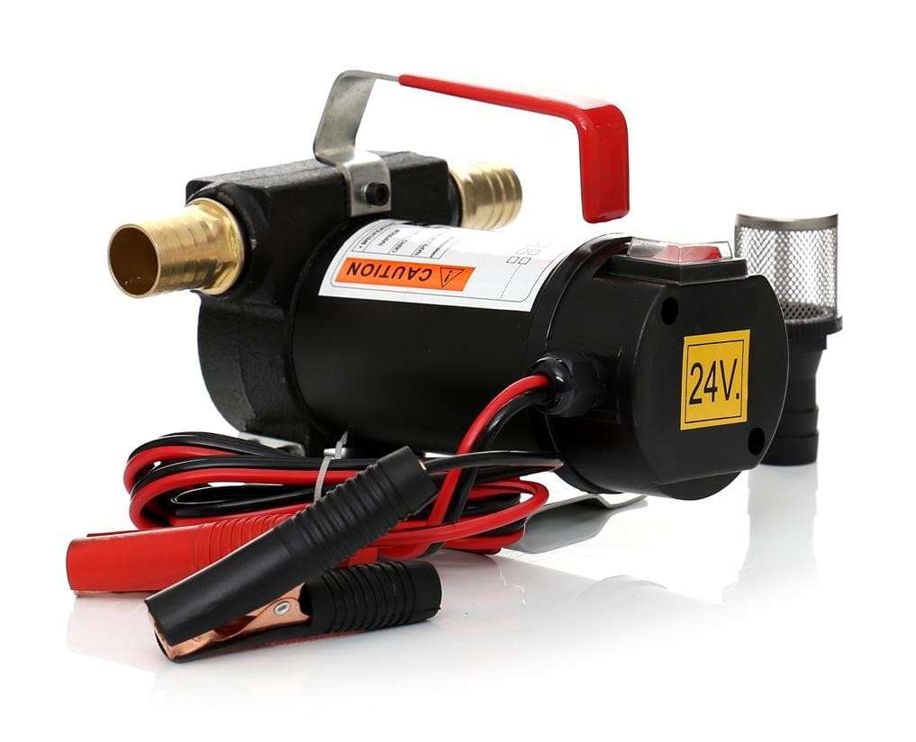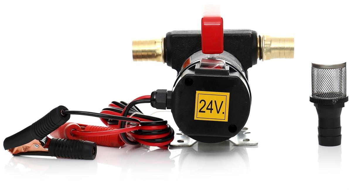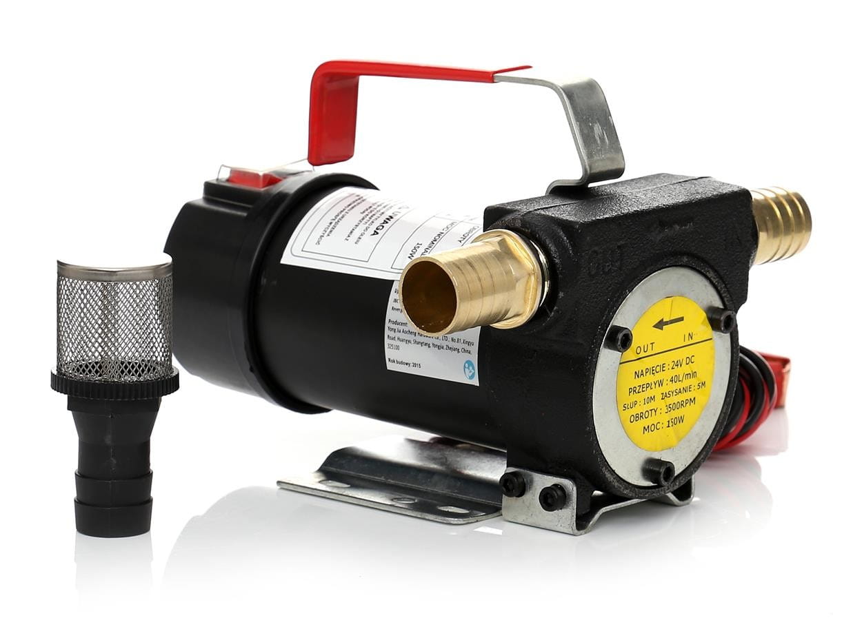 Pompa pracuje przy napięciu 24V, typowym dla układów elektrycznych ciężarówek, autobusów i maszyn roboczych. Podłączenie bezpośrednio do akumulatora eliminuje konieczność dostępu do sieci 230V — urządzenie można użytkować w terenie, na placu budowy lub w miejscu awarii pojazdu.