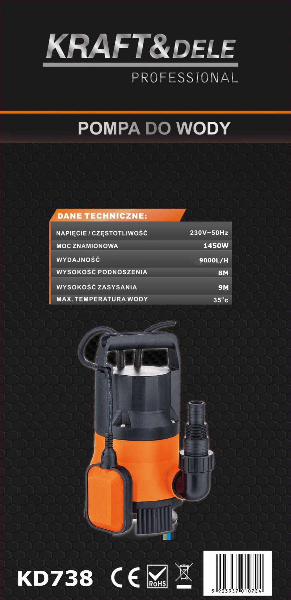 KD738 to pompa zanurzeniowa z hermetyczną obudową, przeznaczona do pompowania zarówno wody czystej, jak i wody zanieczyszczonej drobnymi cząstkami stałymi do 0,2 mm. Urządzenie pracuje w pełnym zanurzeniu i jest wyposażone w automatyczny sterownik pływakowy.
