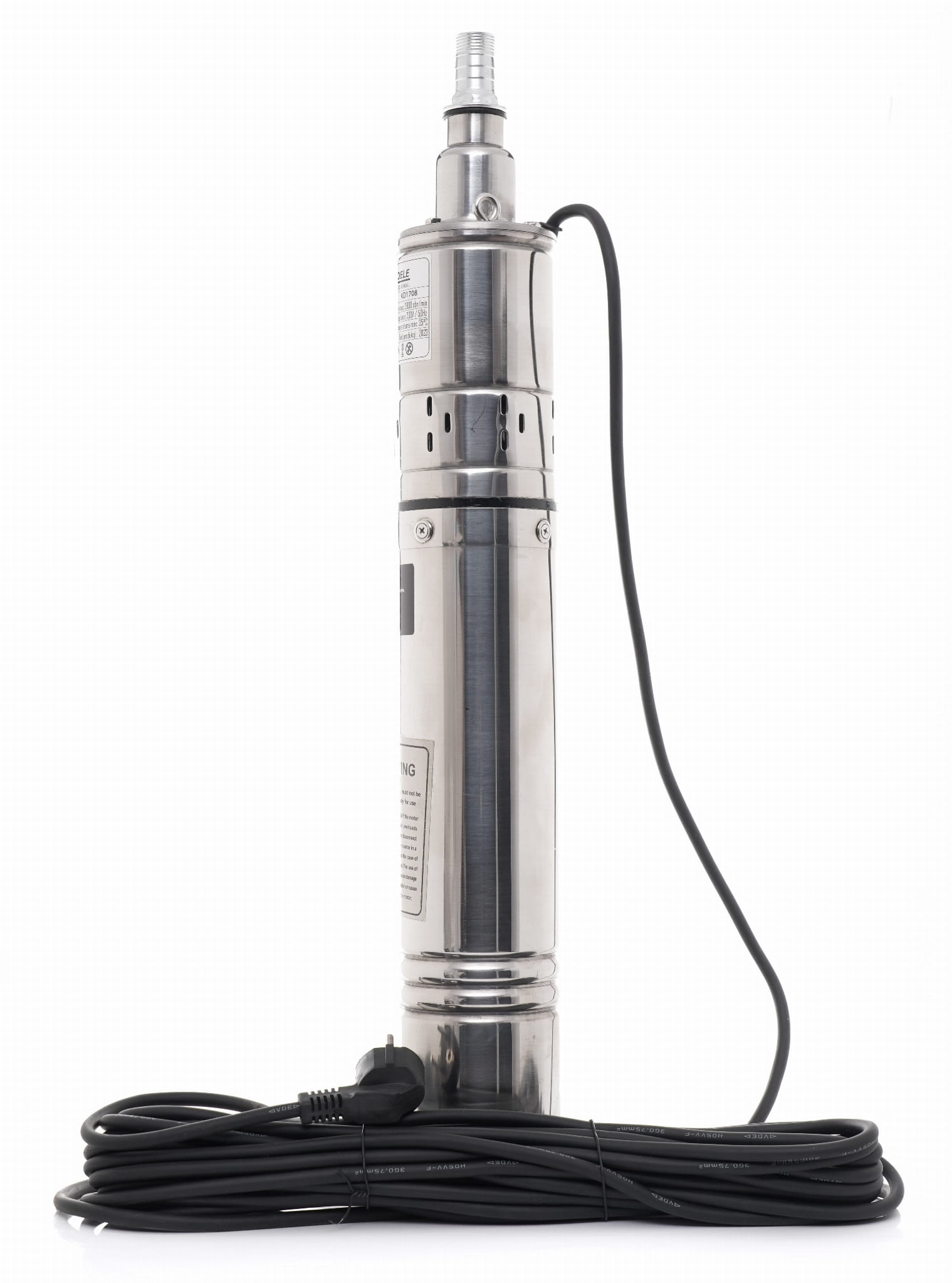 KD1708 to jednofazowa pompa głębinowa o konstrukcji śrubowej, przeznaczona do poboru czystej wody ze studni wierconych oraz do pracy w instalacjach hydroforowych. Rozmiar obudowy 4"/100 mm pozwala na montaż w standardowych studniach wierconych o średnicy od 4 cali.