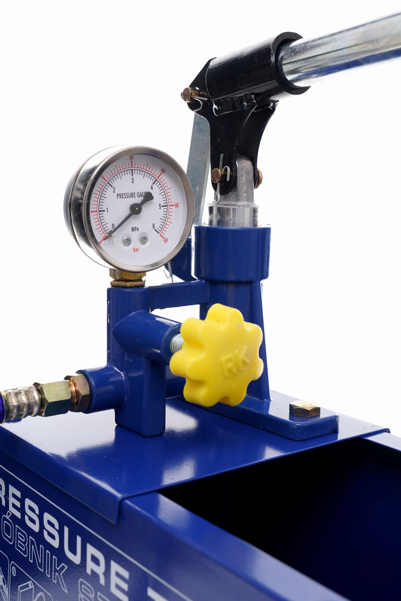 Ręczna pompa tłokowa przeznaczona do wykonywania prób szczelności instalacji sanitarnych, grzewczych i hydraulicznych. Umożliwia testowanie z użyciem wody lub oleju jako cieczy roboczej, generując ciśnienie do 50 bar.