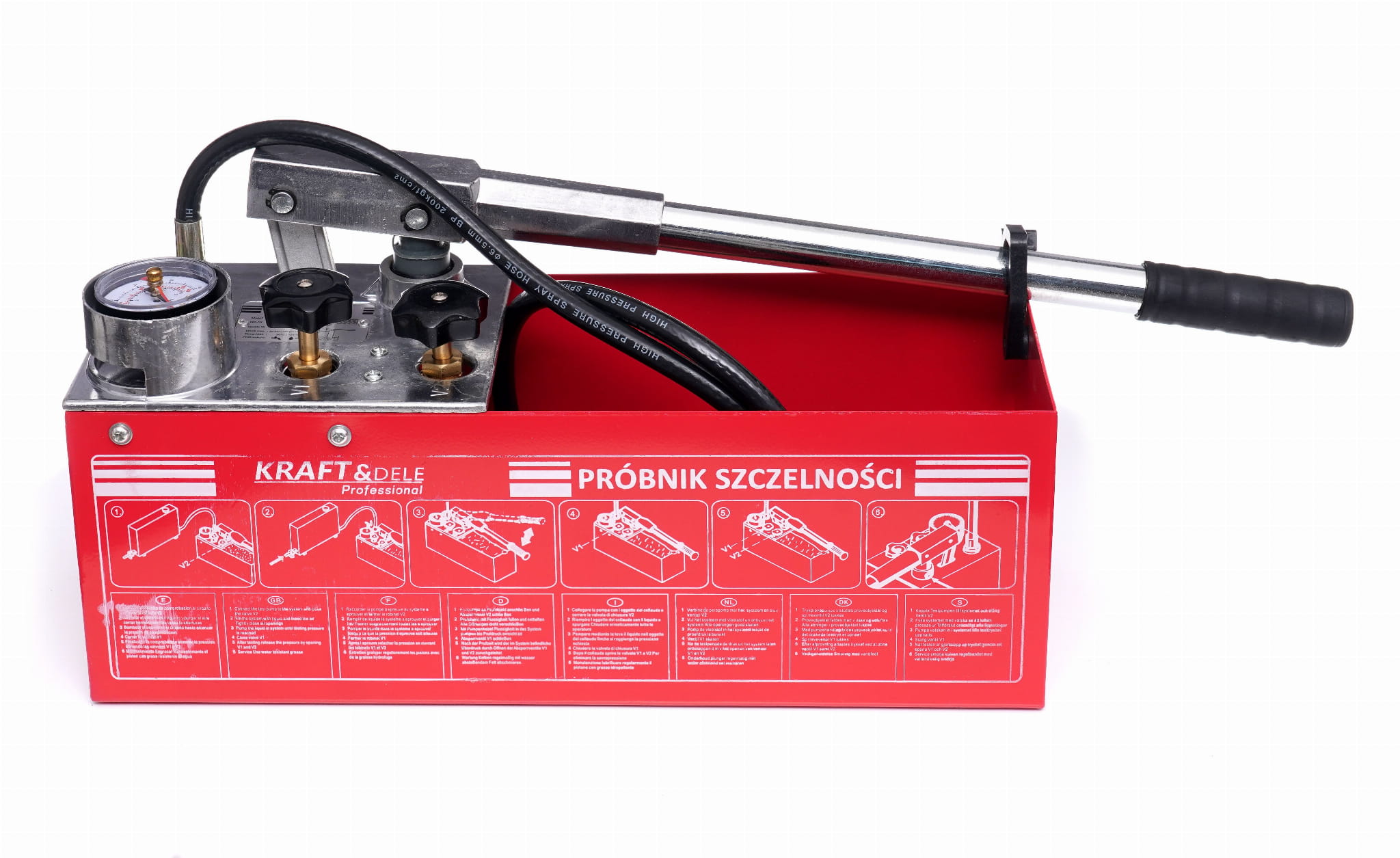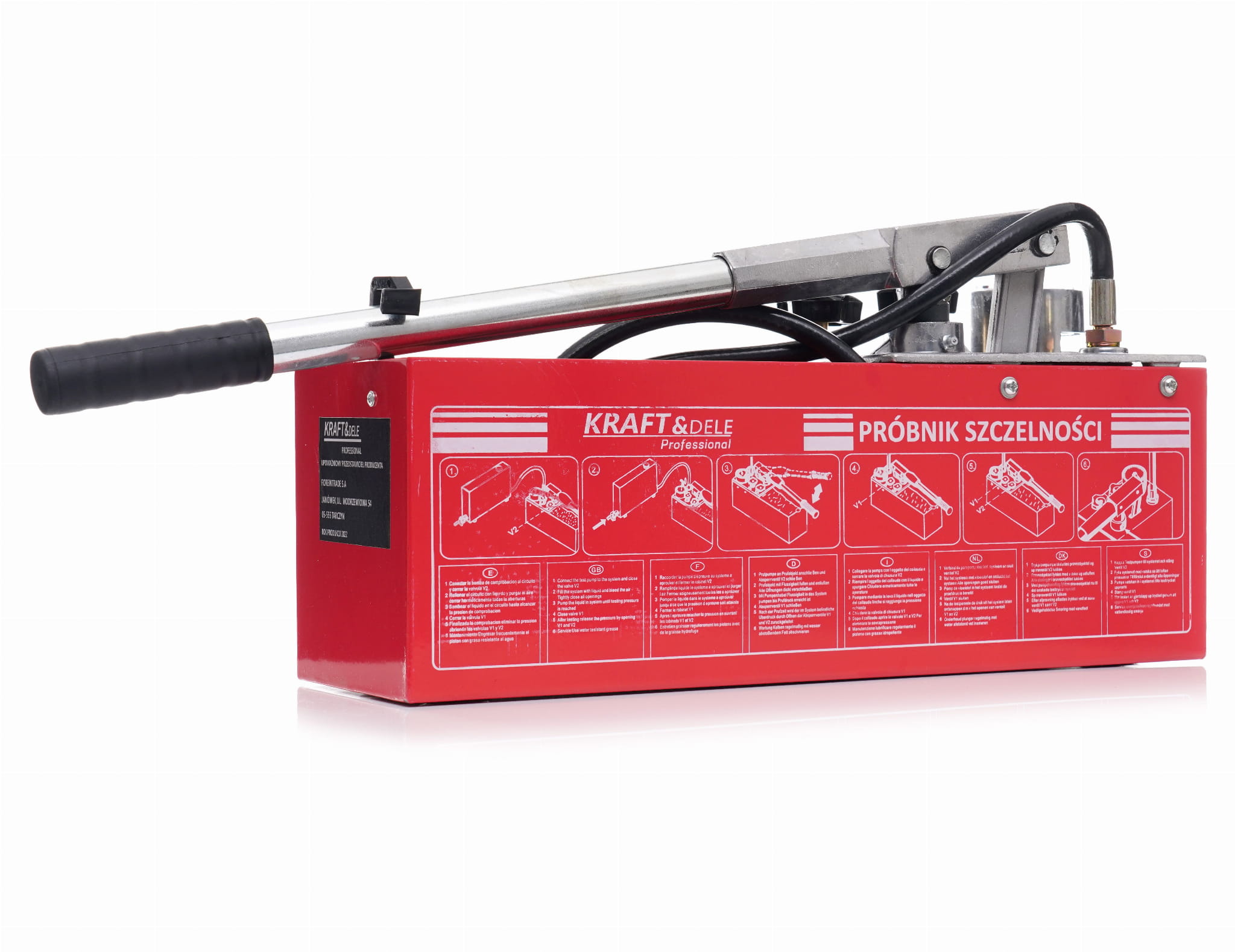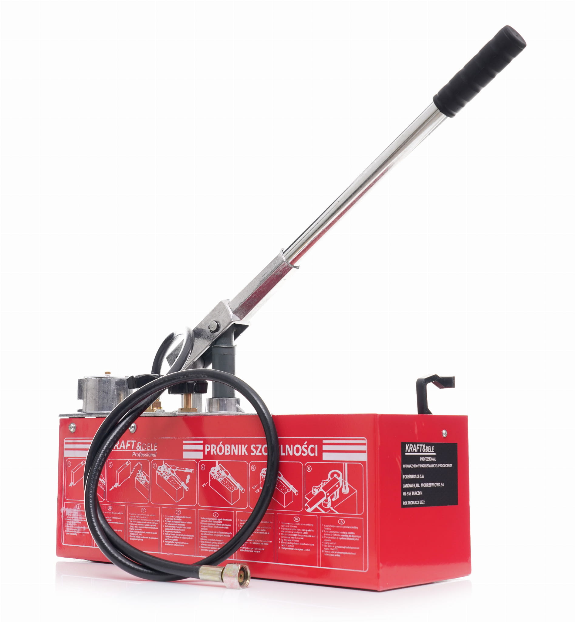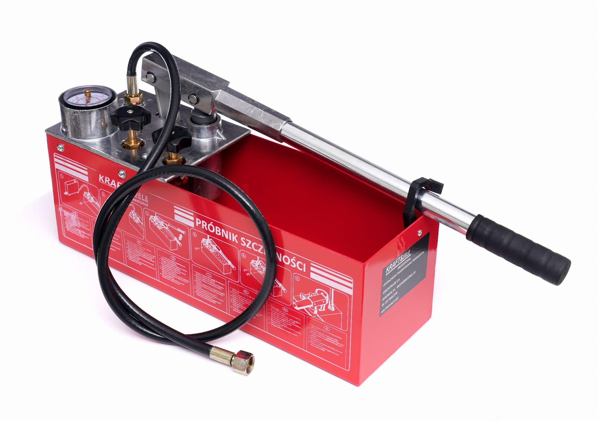 KD10478 to ręczna pompa tłokowa marki Kraft&Dele przeznaczona do wykonywania prób ciśnieniowych i prób szczelności instalacji sanitarnych, grzewczych i hydraulicznych. Urządzenie umożliwia napełnianie instalacji cieczą testową oraz budowanie ciśnienia w jednym cyklu roboczym, z zastosowaniem wody lub oleju jako medium.