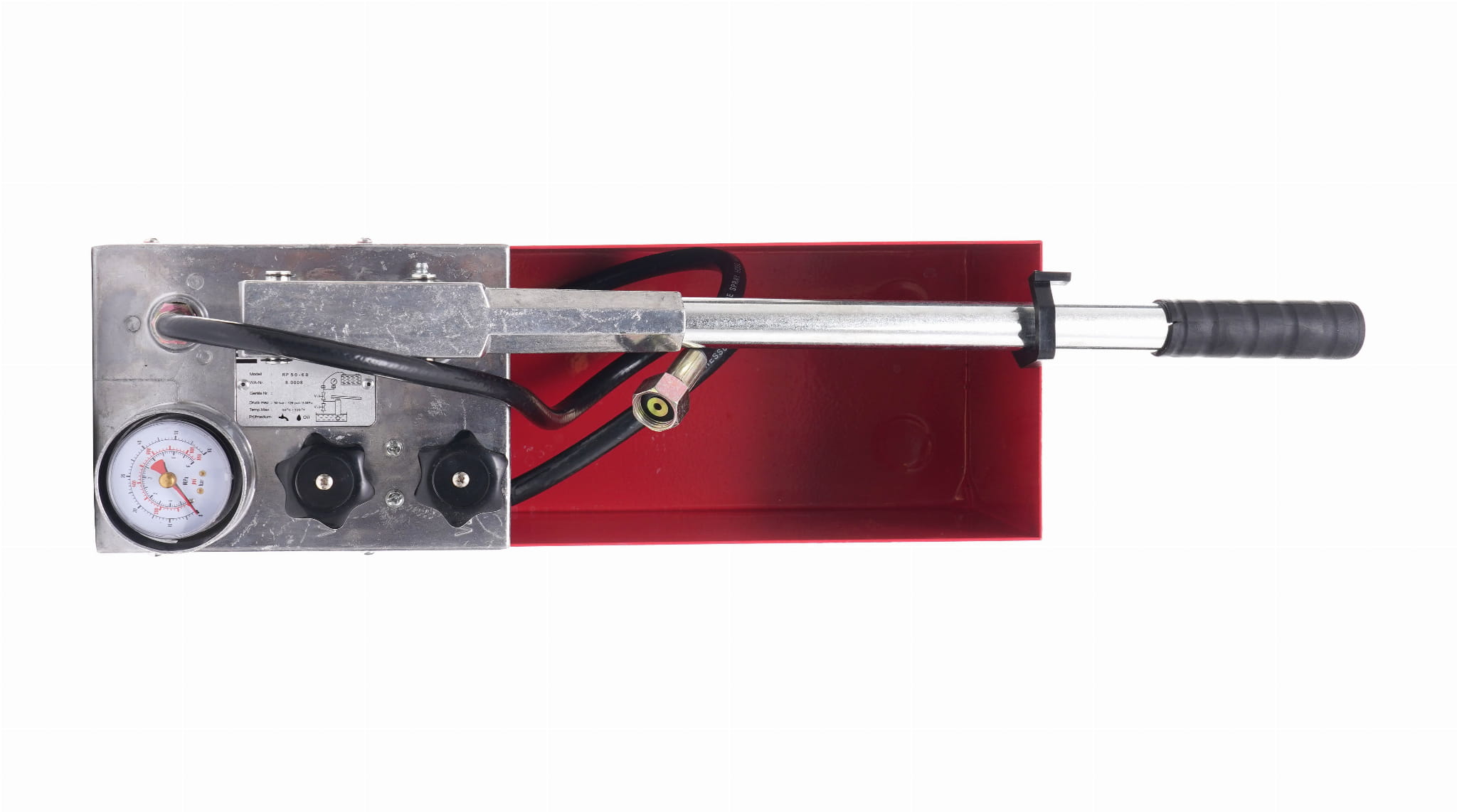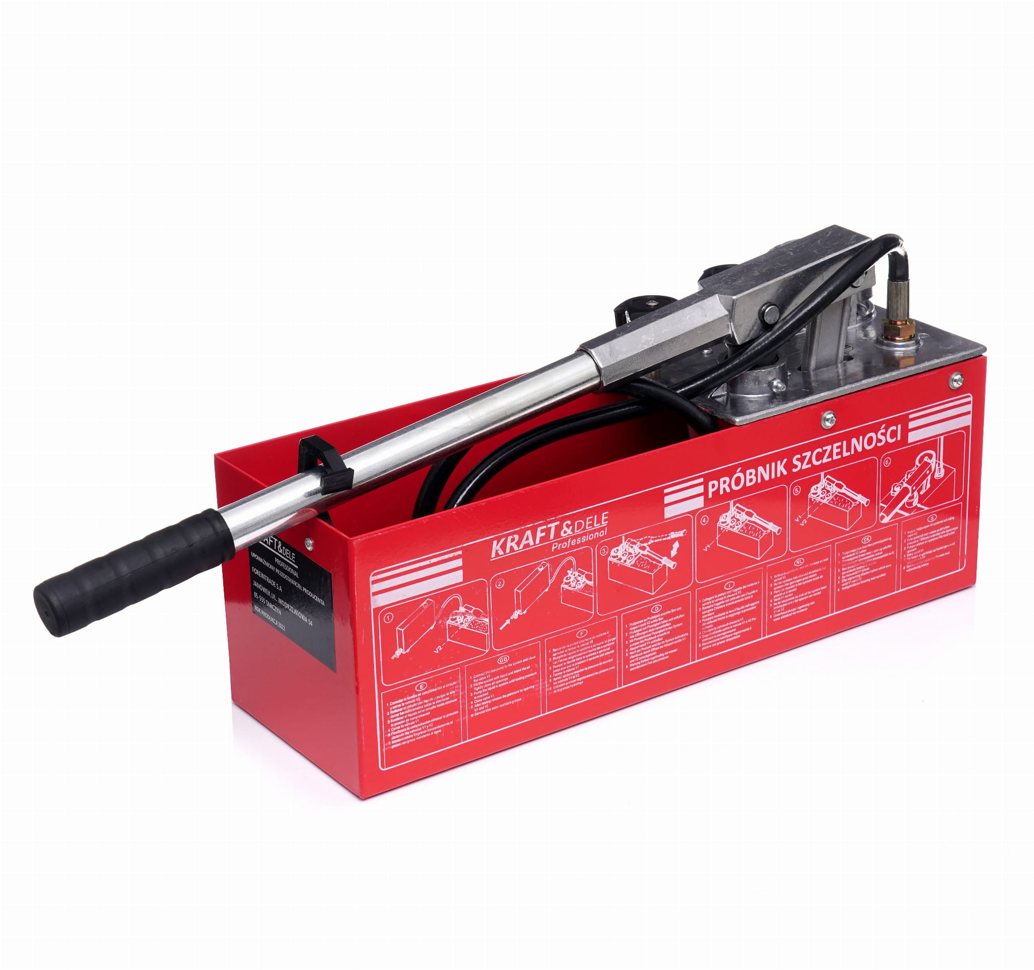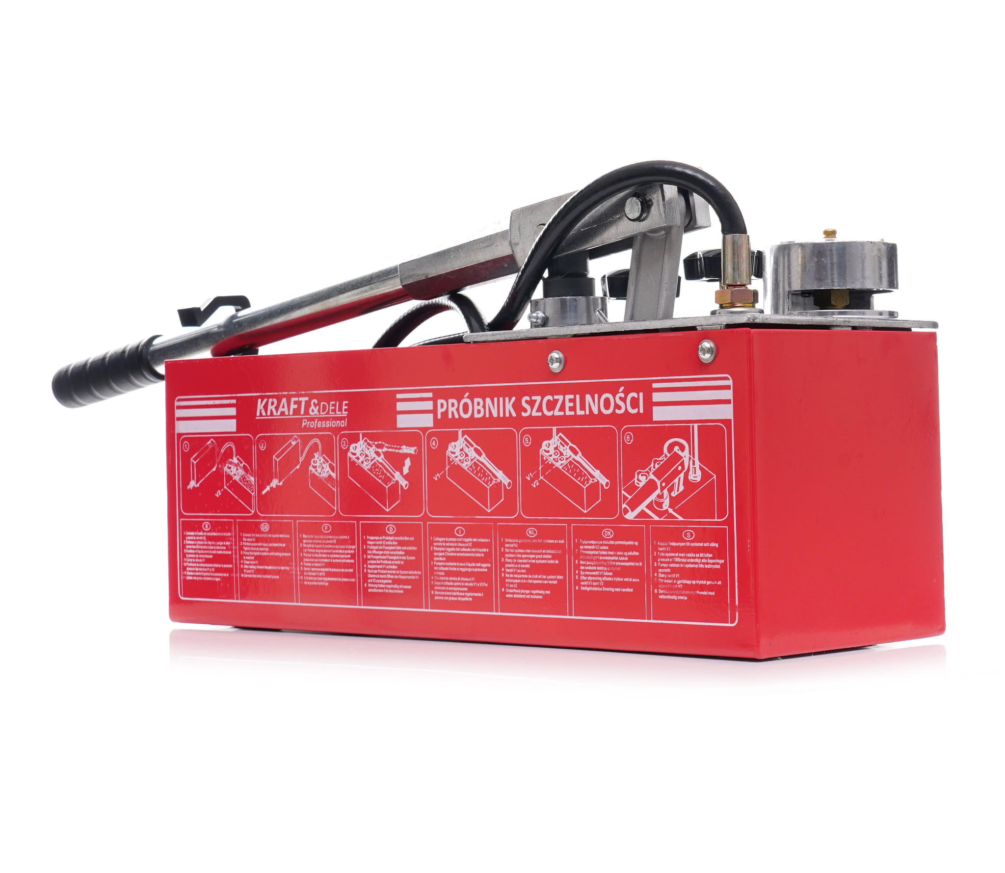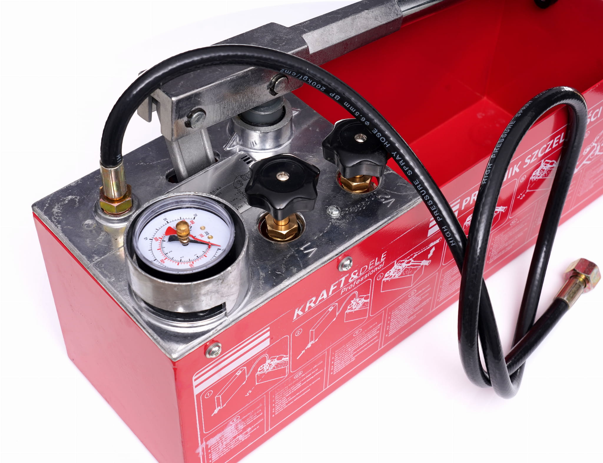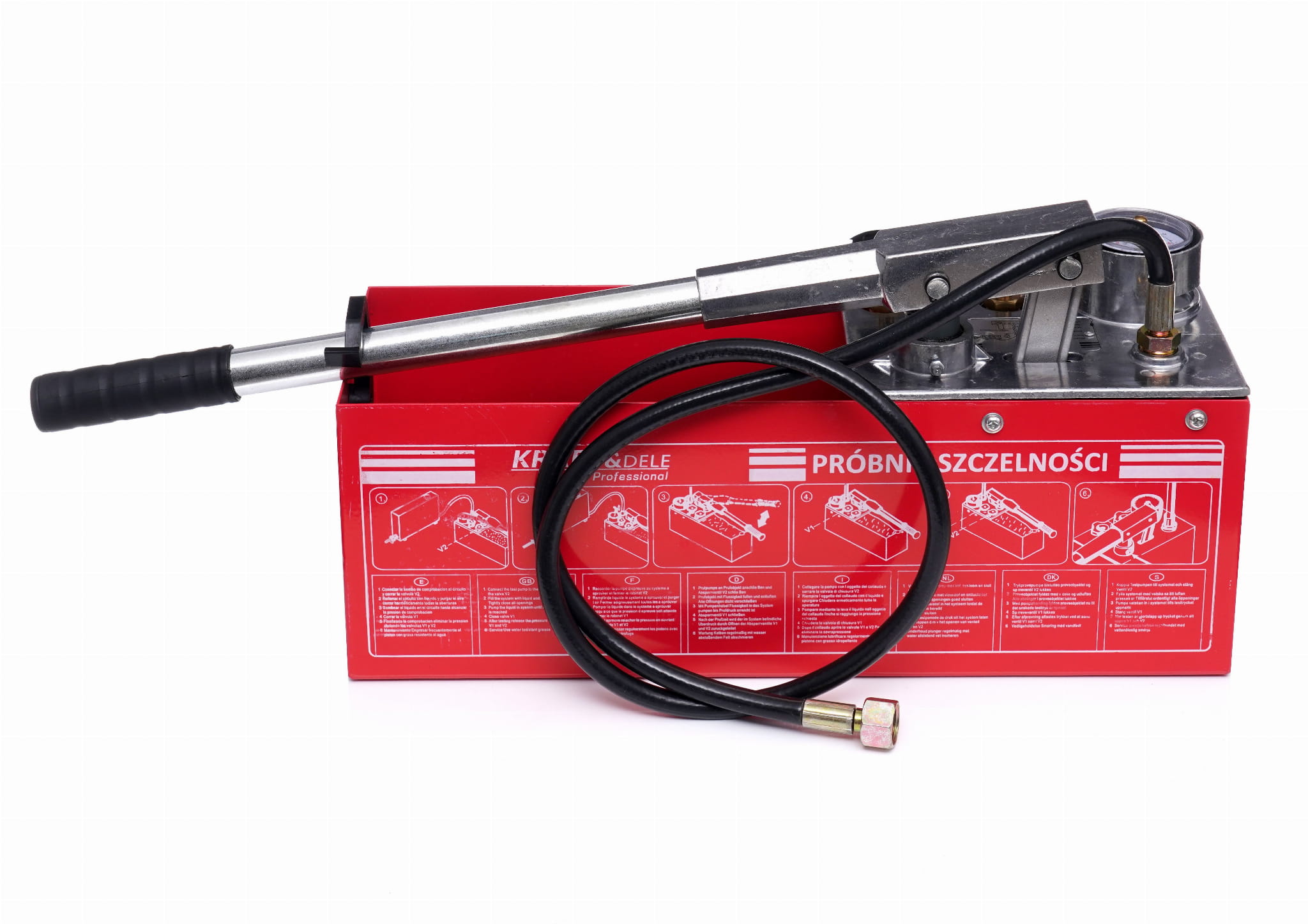 KD10478 to ręczna pompa tłokowa marki Kraft&Dele przeznaczona do wykonywania prób ciśnieniowych i prób szczelności instalacji sanitarnych, grzewczych i hydraulicznych. Urządzenie umożliwia napełnianie instalacji cieczą testową oraz budowanie ciśnienia w jednym cyklu roboczym, z zastosowaniem wody lub oleju jako medium.