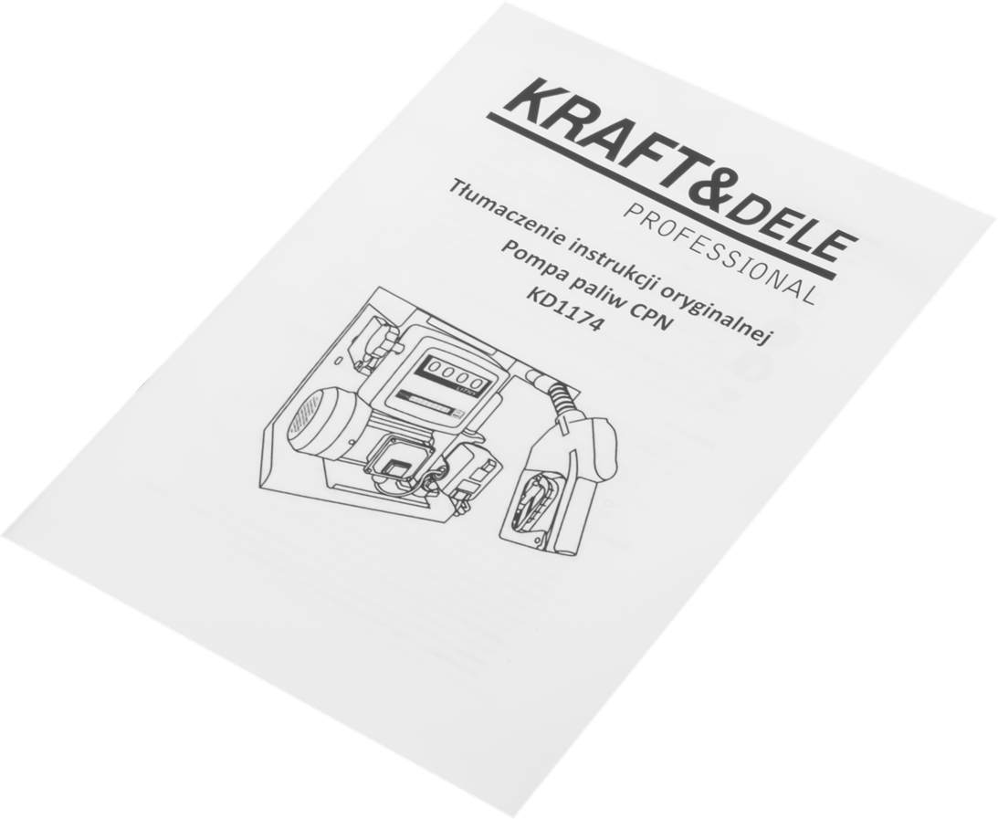 W skład zestawu wchodzą: pompa paliwa KD1174, wąż ssący i tłoczny, automatyczny pistolet nalewowy z systemem AUTO STOP, przewód zasilający, króćce z zaworem na końcu węża ssawnego oraz instrukcja obsługi w języku polskim.