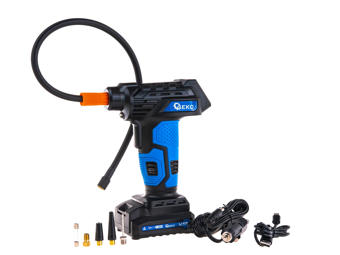 Kompresor G80649 · Akumulator 12V 1,5 Ah · Wężyk 50 cm · Kabel USB-C do ładowania · Kabel do ładowania z gniazda zapalniczki · 2 końcówki plastikowe (do pontonów i materacy) · Końcówka igła (do piłek) · Redukcja mosiężna z uszczelką (do wentylów rowerowych Presta) · Zapasowy bezpiecznik rurkowy 15A 250V