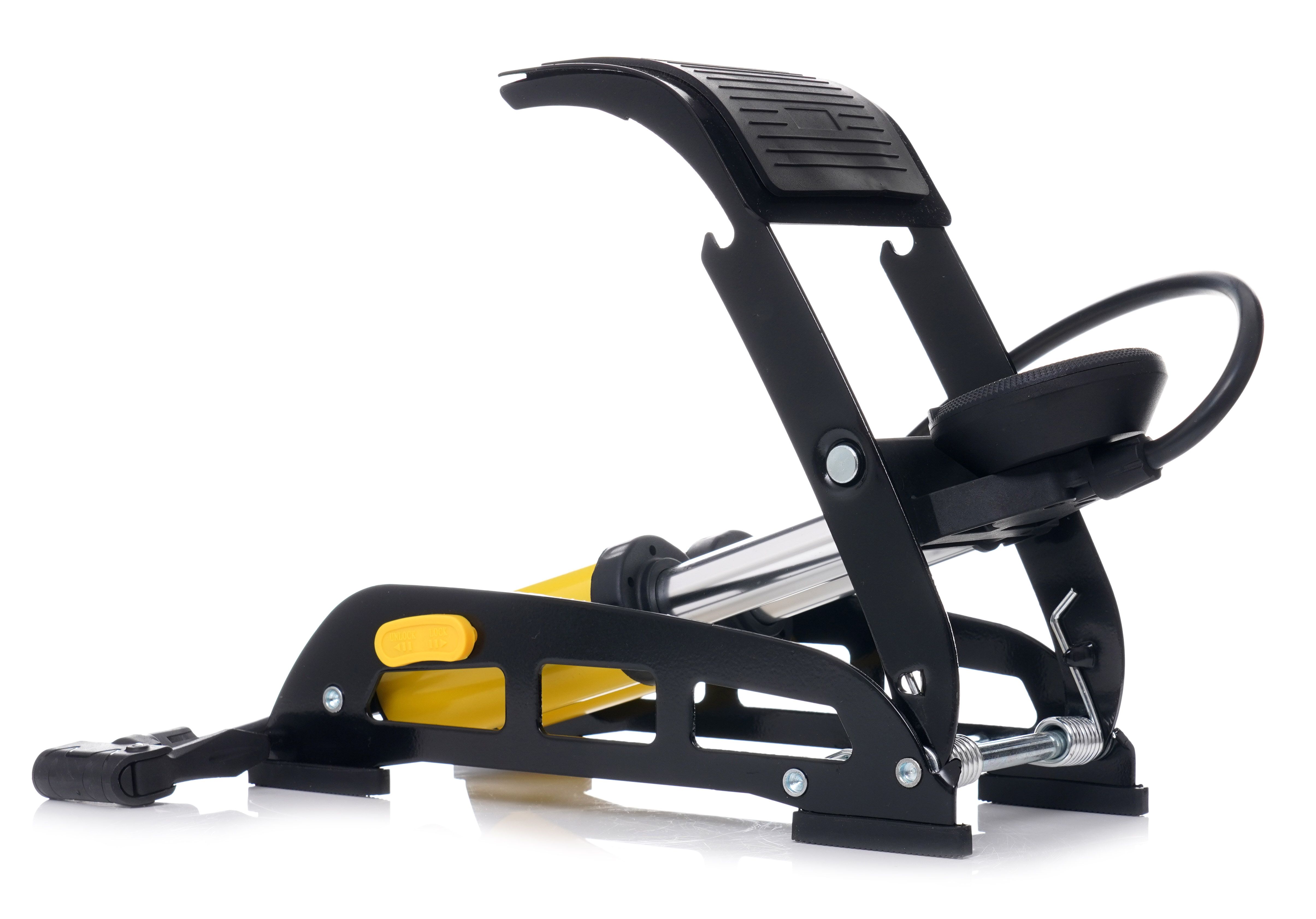 Antypoślizgowy pedał z matą gumową zwiększa kontrolę i komfort użytkowania podczas pompowania.
