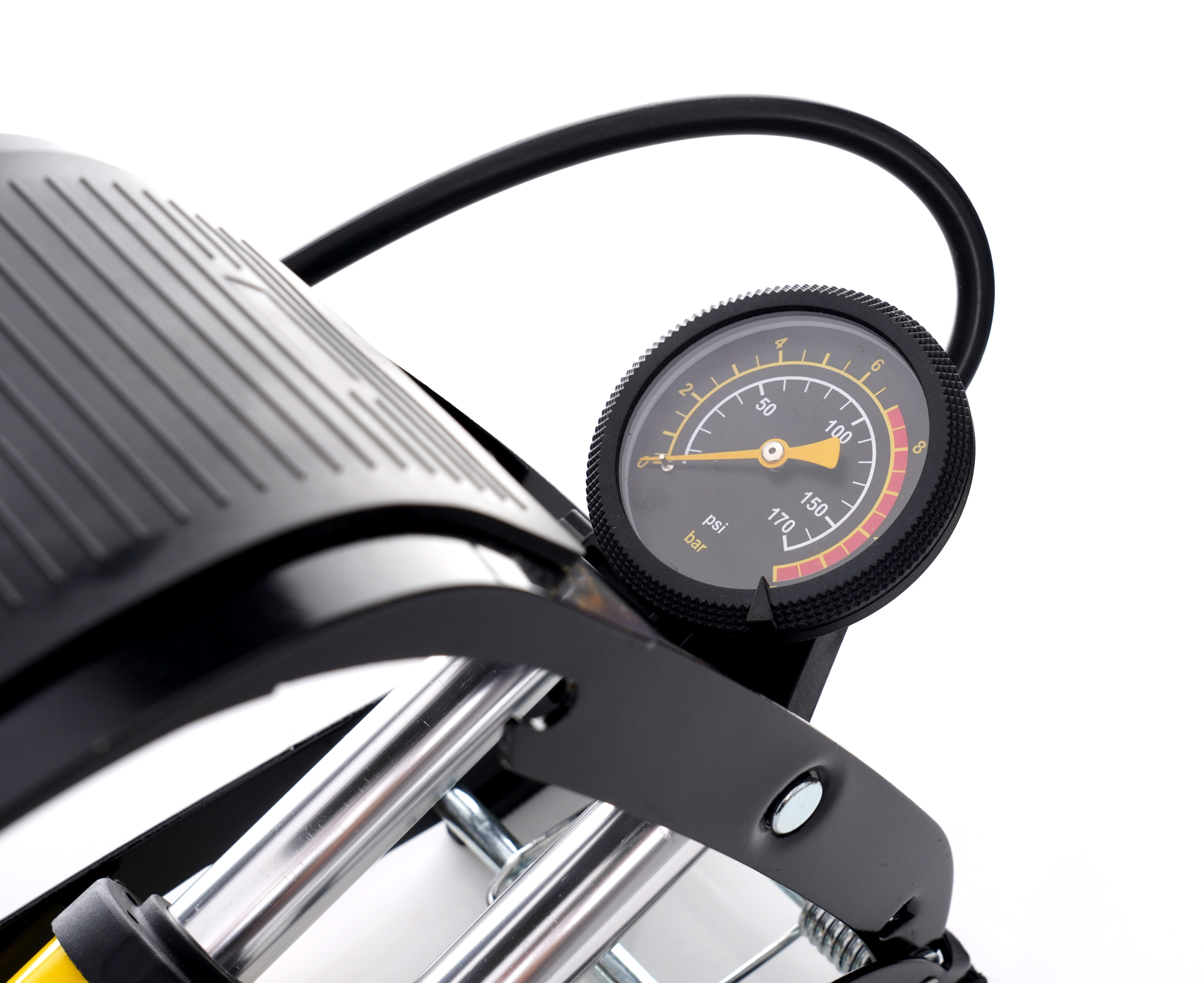Wbudowany manometr ułatwia utrzymanie właściwego ciśnienia i ogranicza ryzyko niedopompowania lub przepompowania.