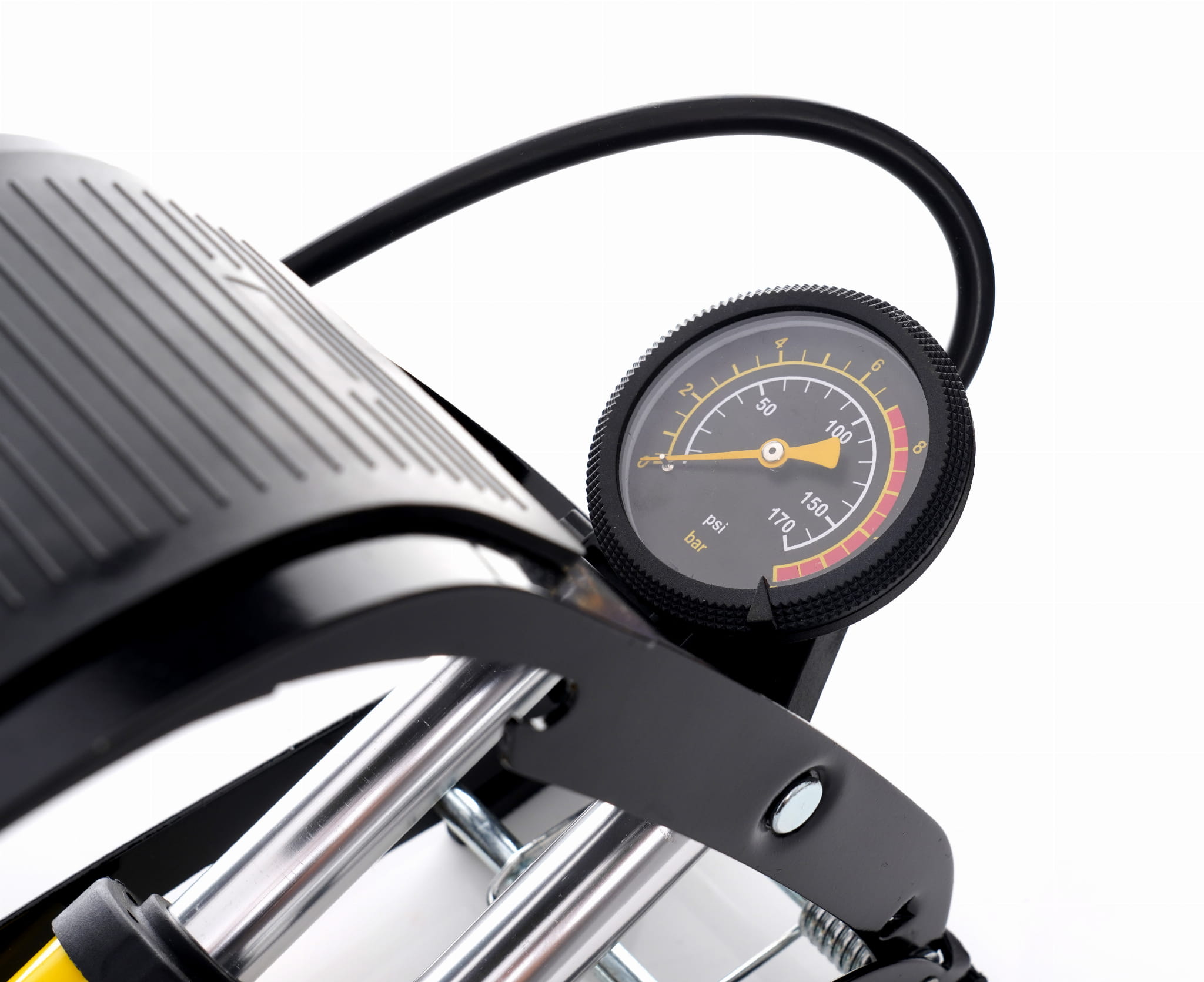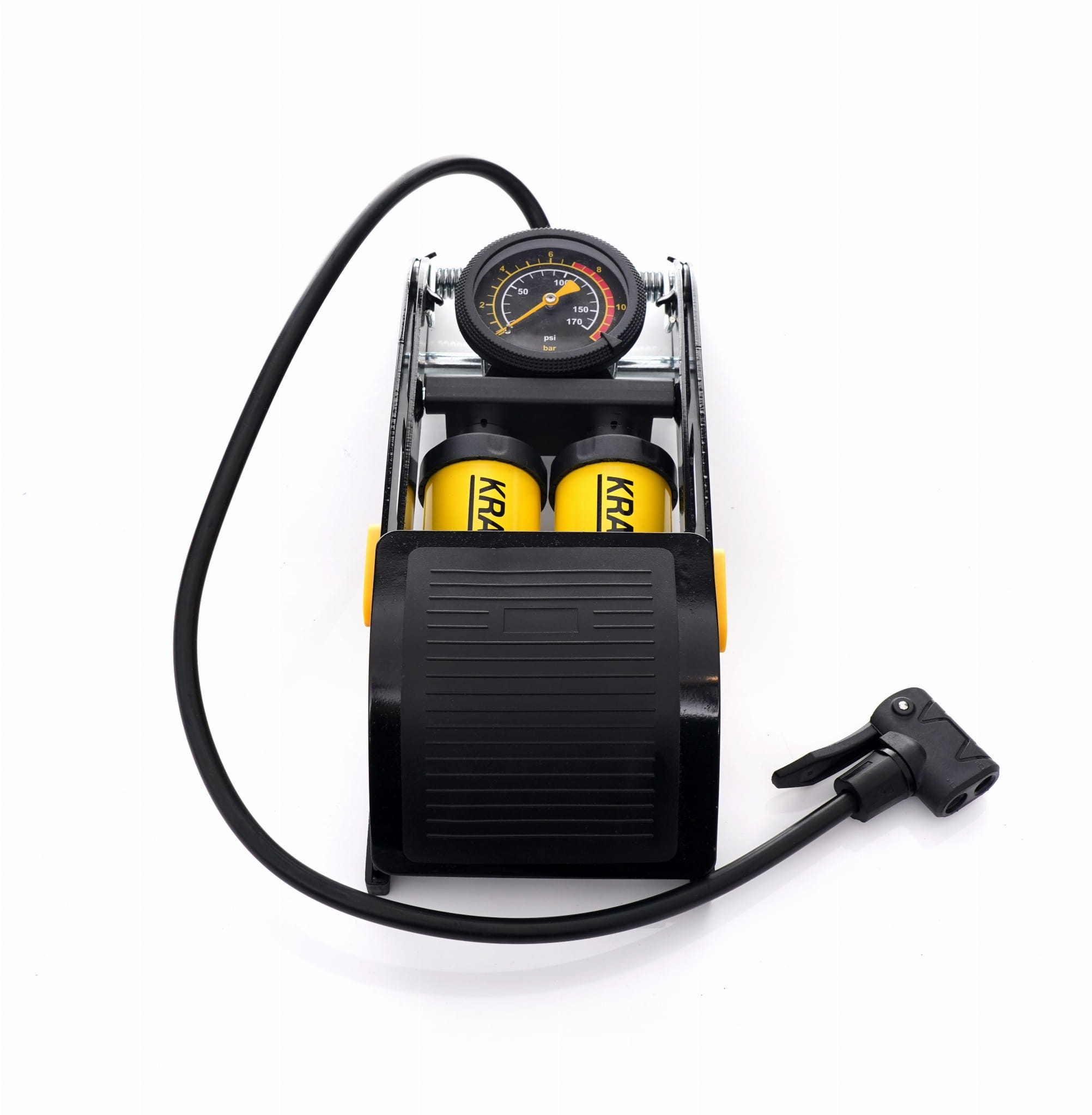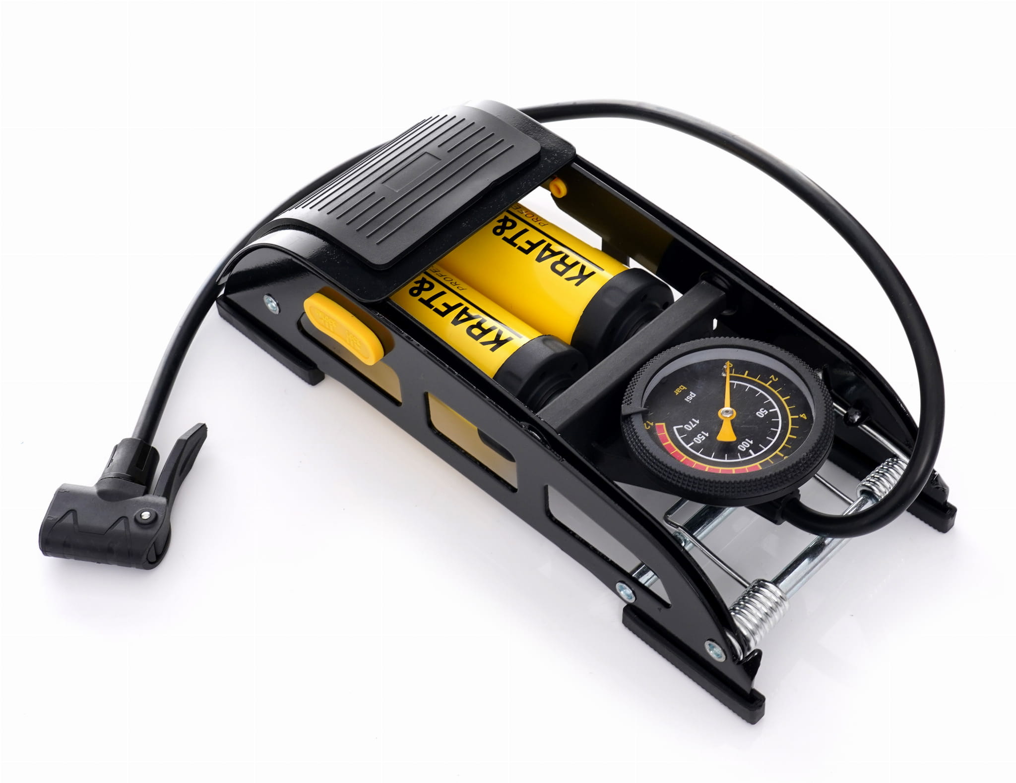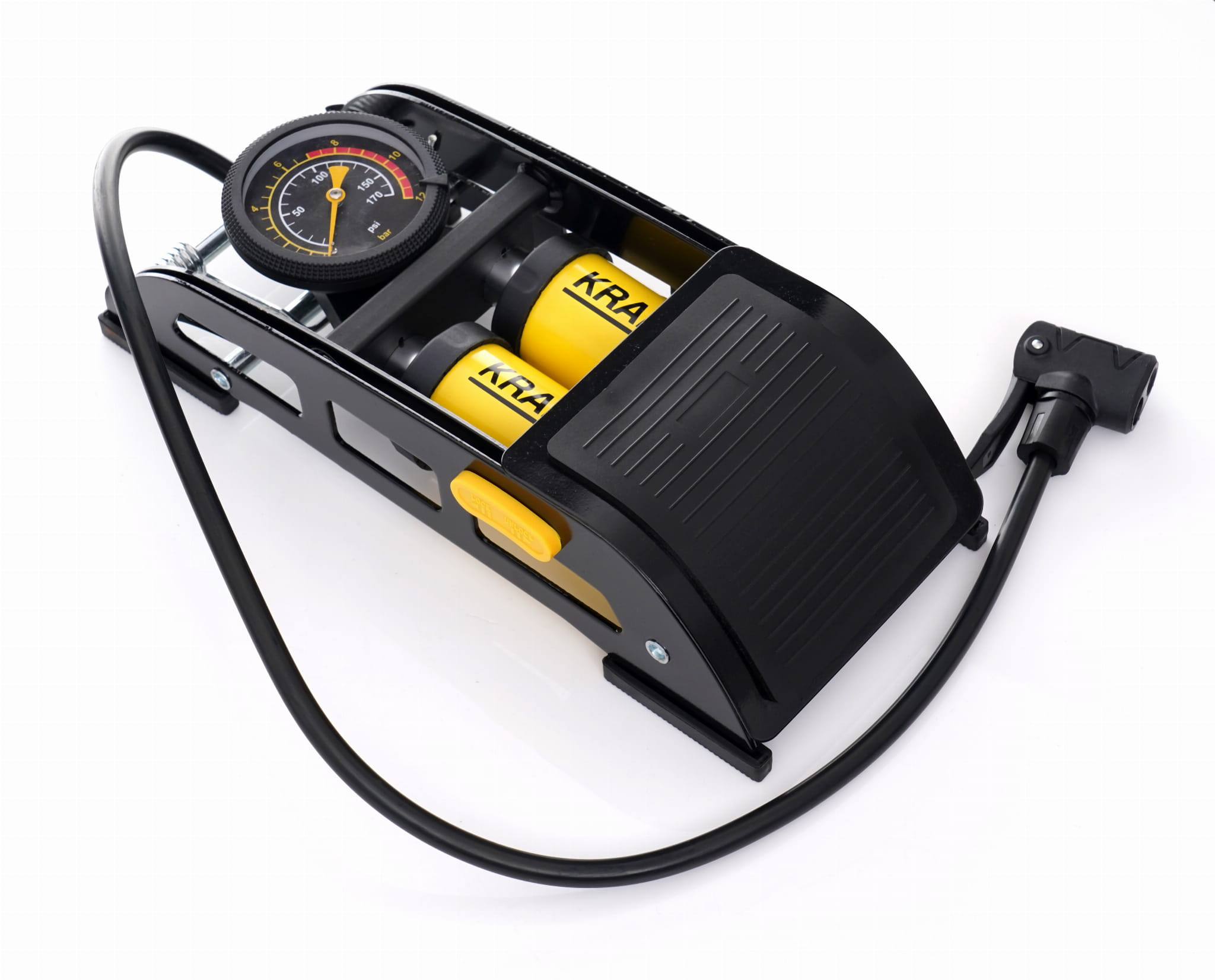 Nożna pompka rowerowa z podwójnym cylindrem, przeznaczona do napompowania i dopompowania kół rowerowych. Stalowa konstrukcja z wbudowanym manometrem umożliwia kontrolę ciśnienia podczas pompowania bez użycia dodatkowych narzędzi.
