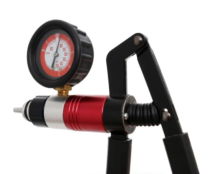 Manometr wbudowany bezpośrednio w korpus pompki umożliwia odczyt wartości ciśnienia lub podciśnienia podczas pracy bez konieczności stosowania dodatkowych przyrządów pomiarowych. Podwójna skala PSI/BAR ułatwia porównywanie wyników z dokumentacją techniczną pojazdu, która może używać różnych jednostek.