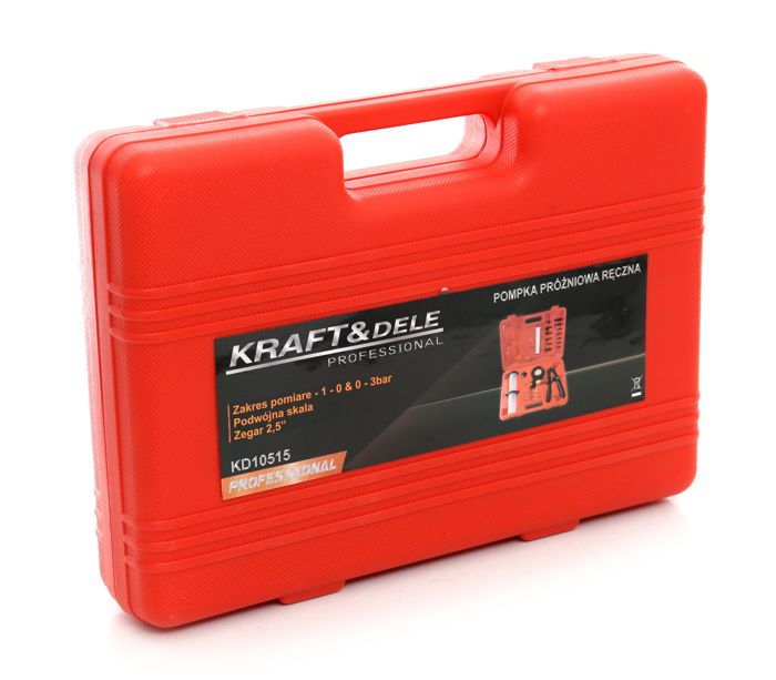 KD10515 to ręczna pompka próżniowa marki Kraft&Dele przeznaczona do diagnostyki i obsługi układów hydraulicznych w pojazdach. Urządzenie wyposażono w zintegrowany manometr próżniowo-ciśnieniowy, a w zestawie znajdują się wszystkie niezbędne akcesoria do podłączenia pompki do różnych punktów serwisowych.