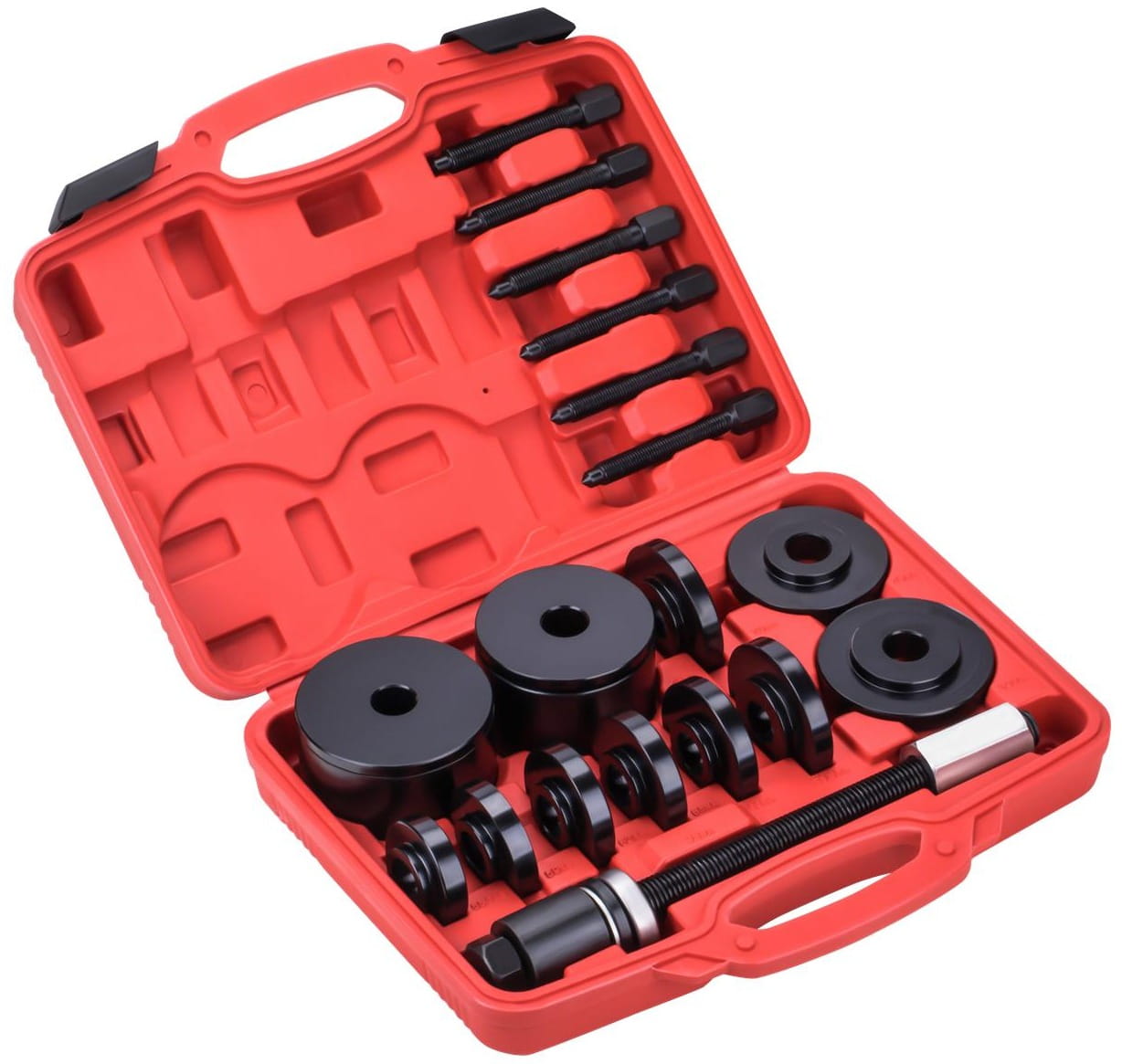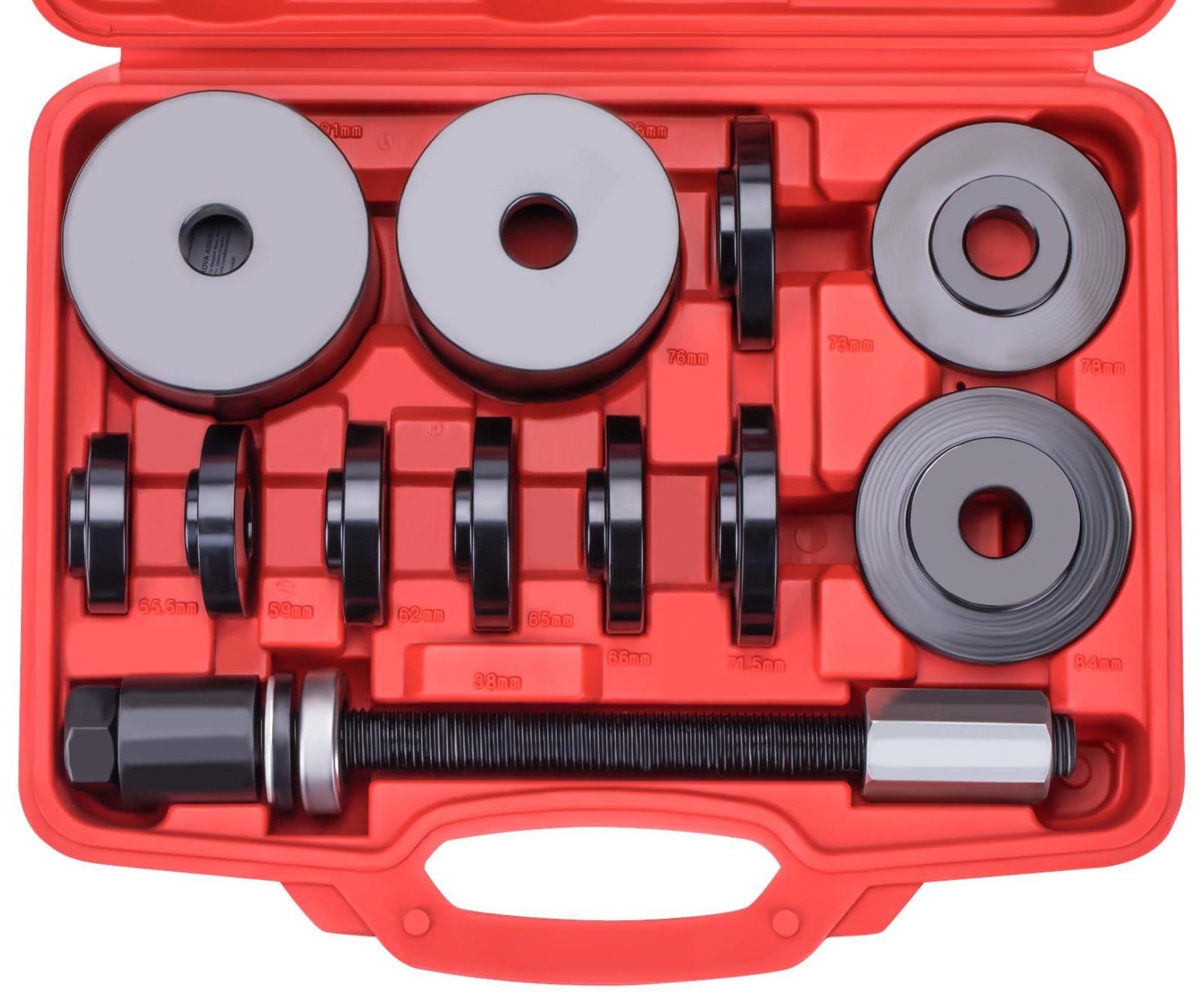 9 dysków (55,5–84 mm) oraz 3 tuleje (76–91 mm) pozwalają dopasować narzędzie do różnych średnic łożysk i piasty. Przed przystąpieniem do pracy należy zmierzyć średnicę zewnętrzną łożyska lub gniazda i dobrać odpowiedni adapter.