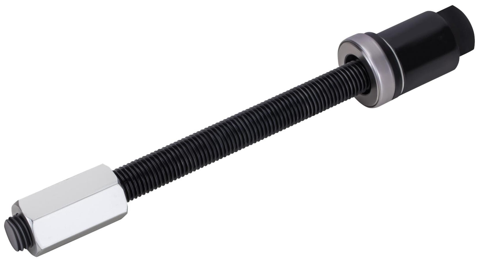 KD12517 to zestaw narzędzi do śrubowego montażu i demontażu łożysk, piasty przedniej, tulei oraz innych zaklinowanych elementów układów napędowych. Metoda śrubowa eliminuje konieczność pobijania, co ogranicza ryzyko uszkodzenia gniazd i sąsiednich komponentów. Zestaw 19 elementów przechowywany jest w walizce z tworzywa sztucznego.