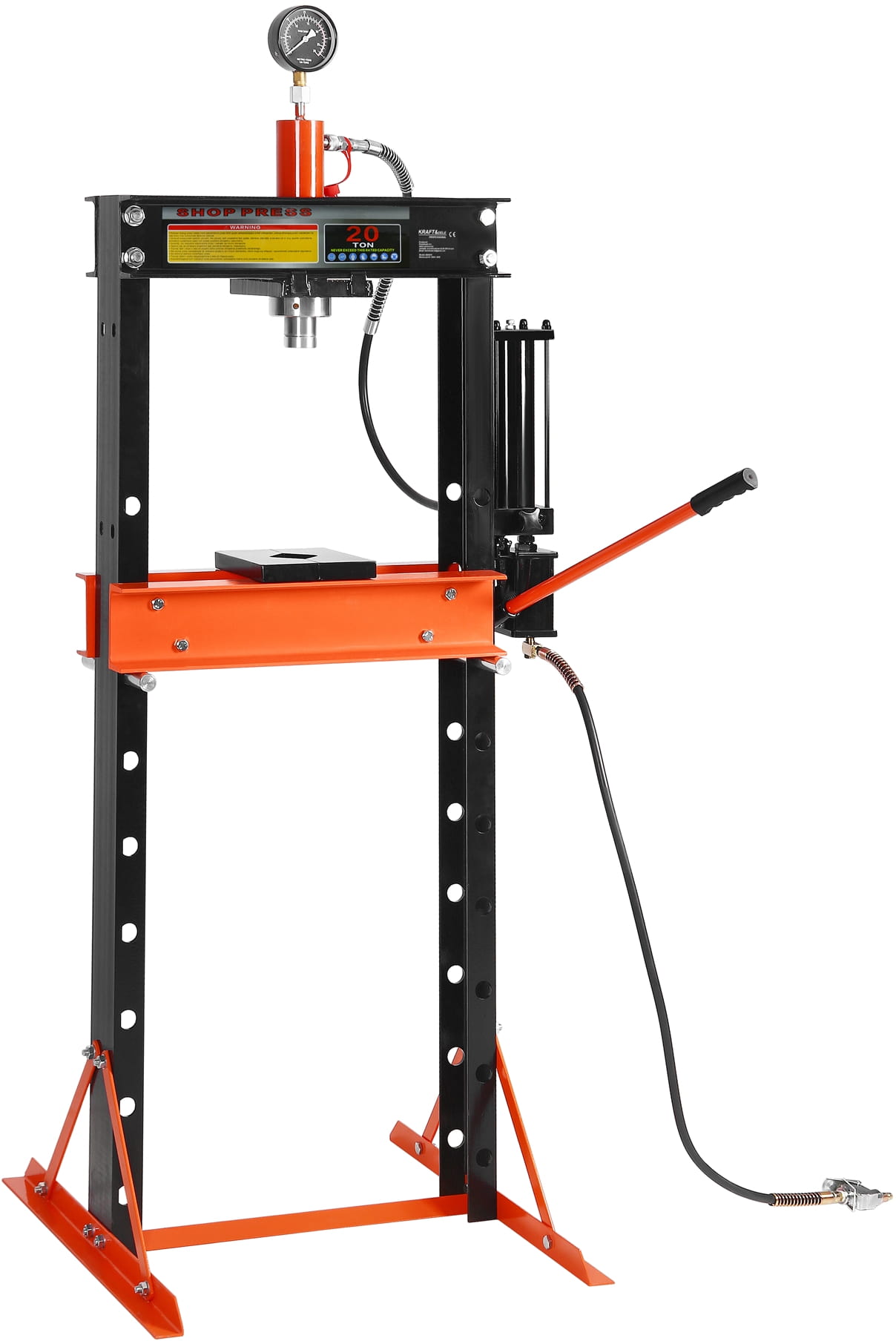 Prasa hydrauliczna KD5875 z przesuwnym tłokiem 20T, dwie żeliwne płyty robocze, instrukcja obsługi w języku polskim, oryginalne opakowanie. Do zestawu dołączany jest dokument sprzedaży (paragon lub faktura VAT) oraz 12-miesięczna gwarancja.
