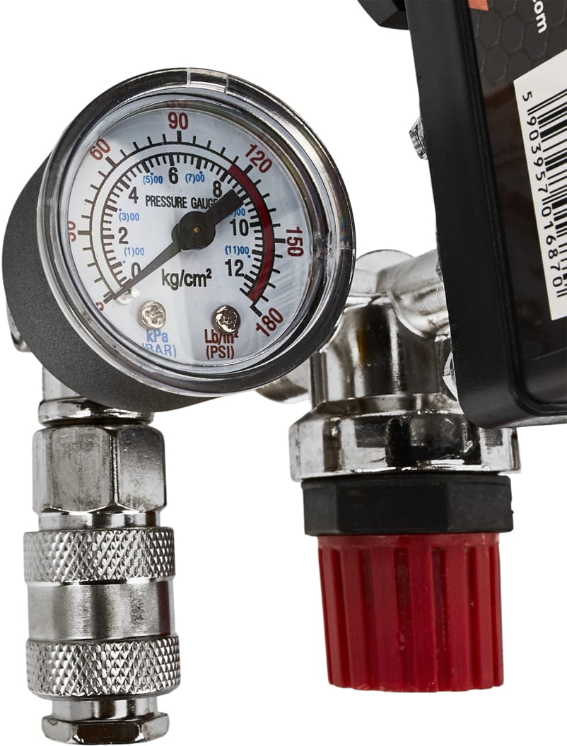 KD2176 to wyłącznik ciśnieniowy przeznaczony do automatycznego sterowania pracą kompresora sprężarkowego. Urządzenie monitoruje ciśnienie w zbiorniku i samoczynnie załącza lub odłącza silnik kompresora po przekroczeniu zaprogramowanych progów — bez ingerencji użytkownika. Model wyposażony jest w dwa manometry, szybkozłączki oraz zawór bezpieczeństwa, co czyni go kompletnym węzłem sterująco-rozdzielczym układu pneumatycznego.