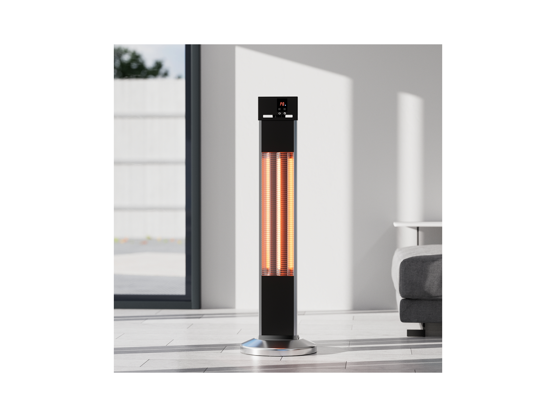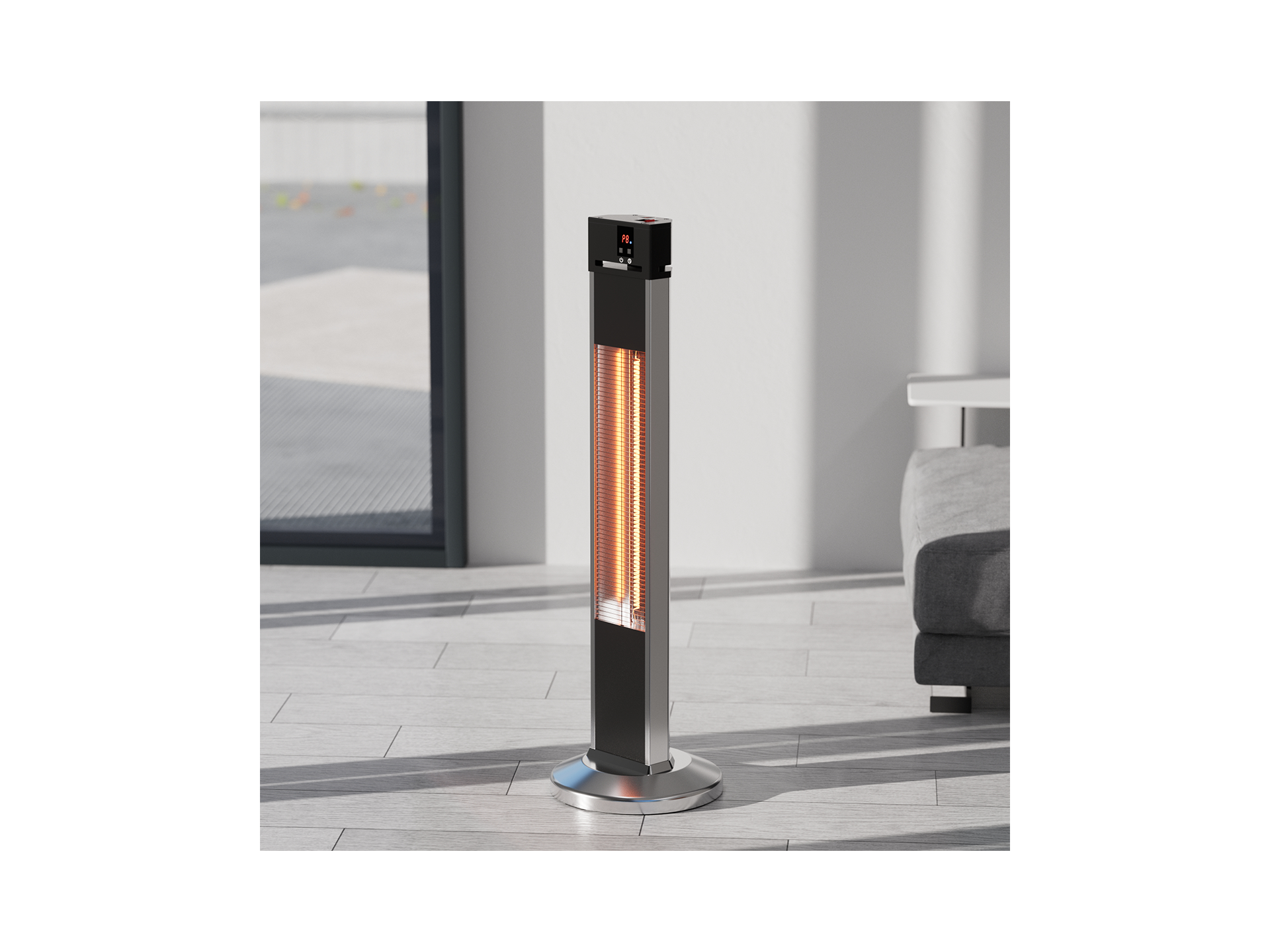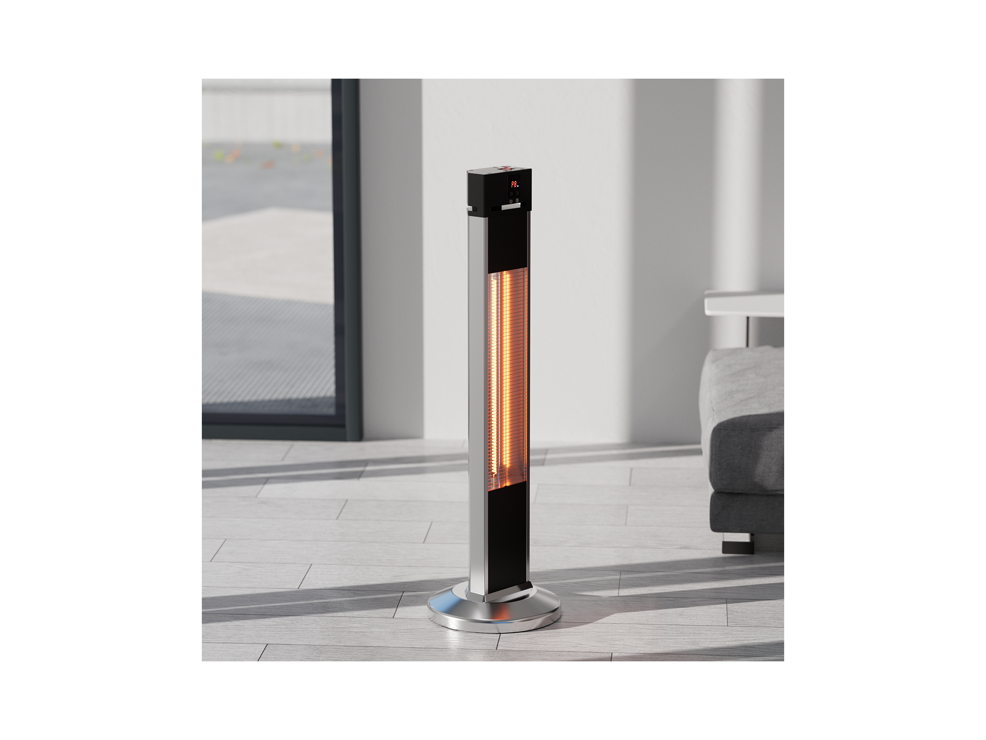 Wolnostojąca konstrukcja promiennika umożliwia ustawienie urządzenia na stabilnej powierzchni bez konieczności montażu ściennego. Aluminiowa obudowa zapewnia odporność na warunki atmosferyczne przy użytkowaniu zewnętrznym zgodnie z klasą IP34.