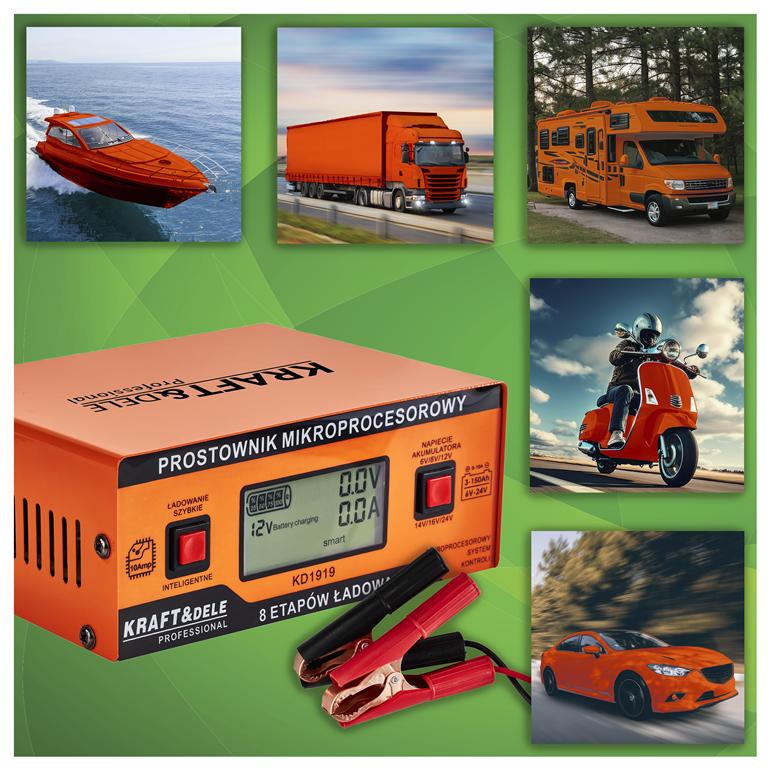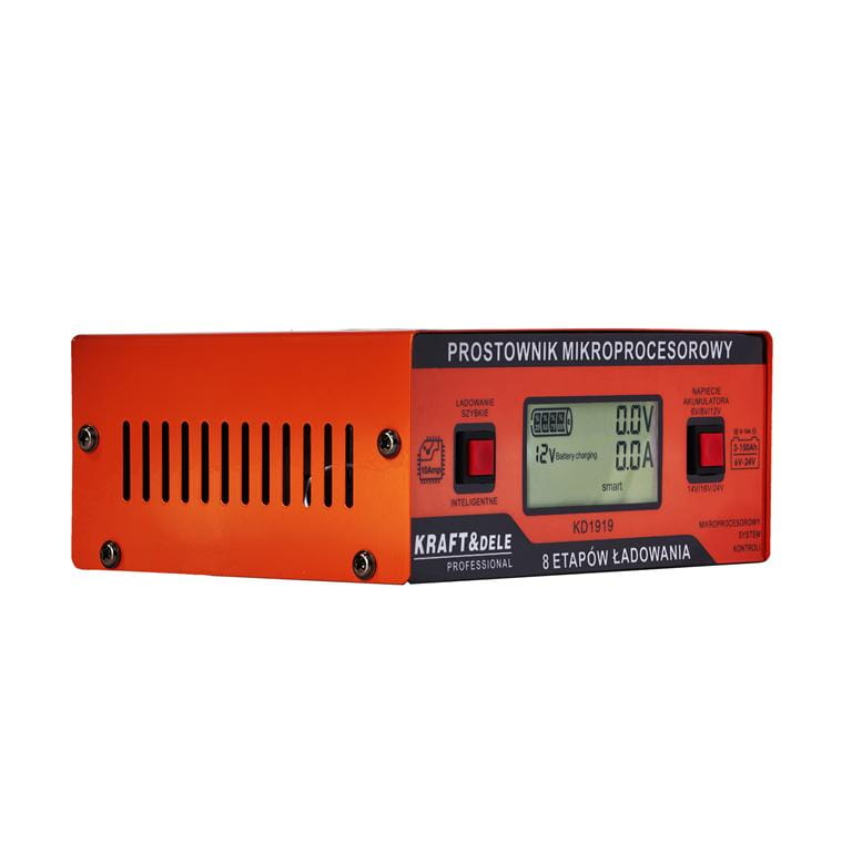 KD1919 to mikroprocesorowy prostownik do ładowania akumulatorów kwasowo-ołowiowych wszystkich popularnych typów: WET, MF, CA, EFB, GEL i AGM. Ośmiostopniowy, w pełni automatyczny proces ładowania oraz cztery tryby pracy pozwalają dostosować urządzenie zarówno do szybkiego uzupełniania energii, jak i do długoterminowej konserwacji akumulatora.
