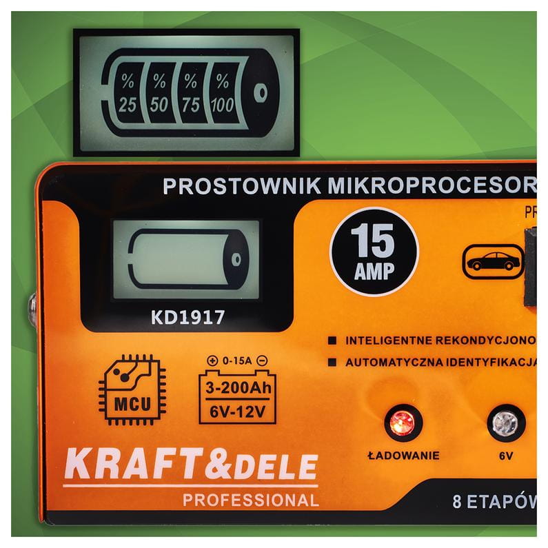 KD1917 to mikroprocesorowy prostownik do ładowania akumulatorów kwasowo-ołowiowych wszystkich popularnych typów. Urządzenie realizuje 8-stopniowy automatyczny proces ładowania, samodzielnie dobierając parametry pracy do stanu i pojemności podłączonego akumulatora. Obsługuje zarówno napięcie 6V, jak i 12V, a maksymalny prąd ładowania wynosi 15A.