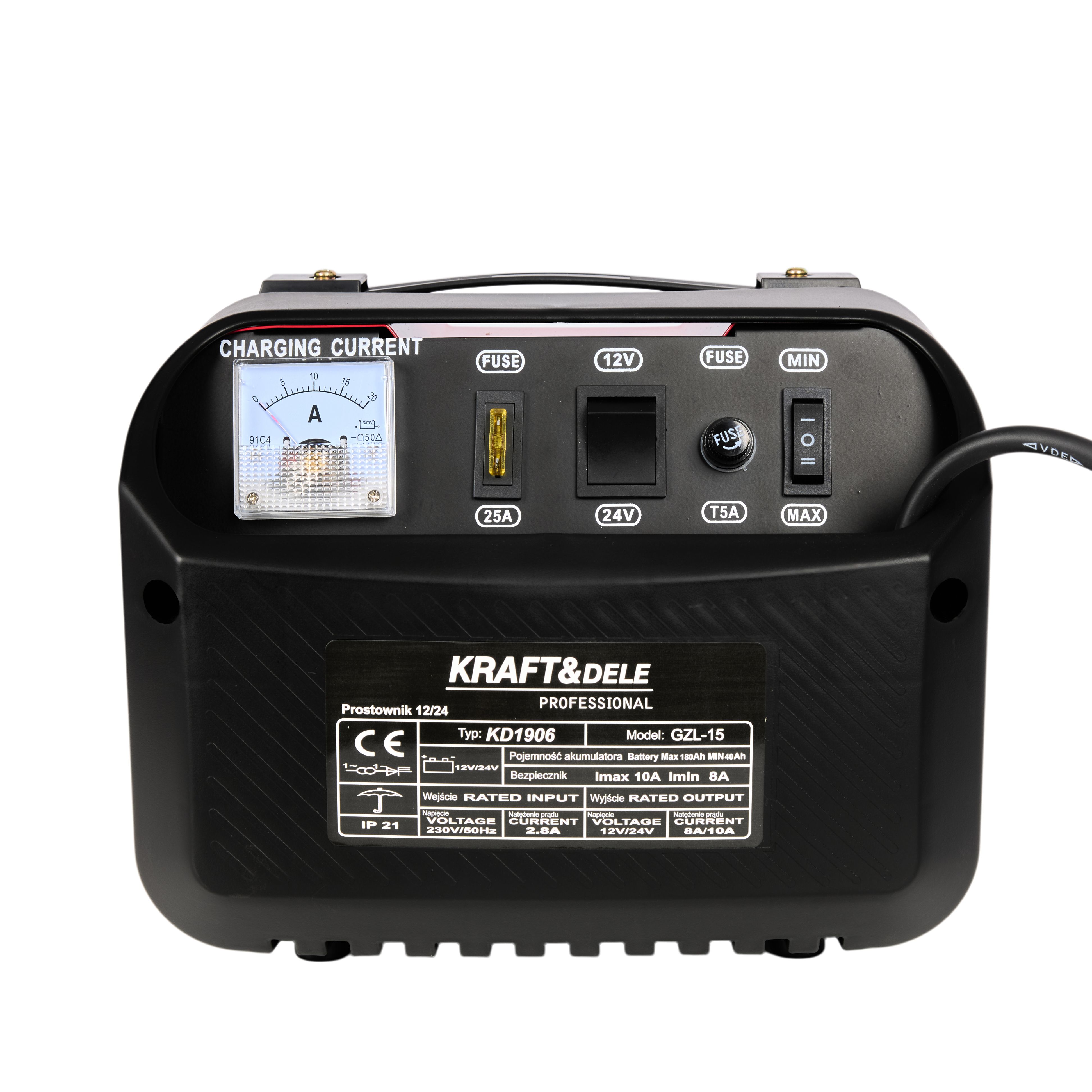 Prostownik samochodowy 12/24V 15A 150Ah KD1906 KRAFT&DELE to praktyczny prostownik akumulatorowy do regularnej obsługi akumulatorów w zakresie 12V/24V. Model KD1906 oferuje szybkie ładowanie, amperomierz oraz zabezpieczenia, dzięki czemu dobrze sprawdza się jako pewne narzędzie do garażu i warsztatu.