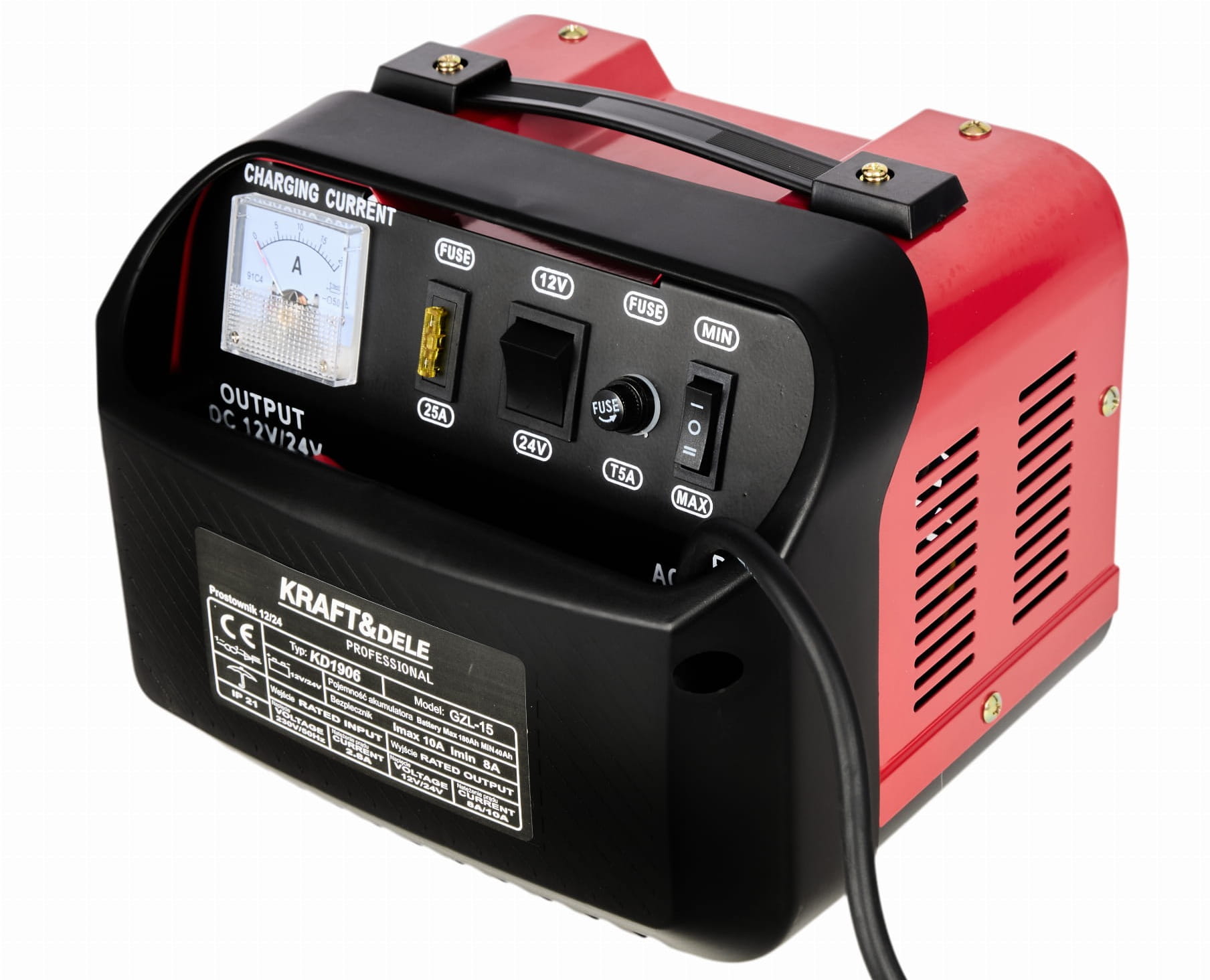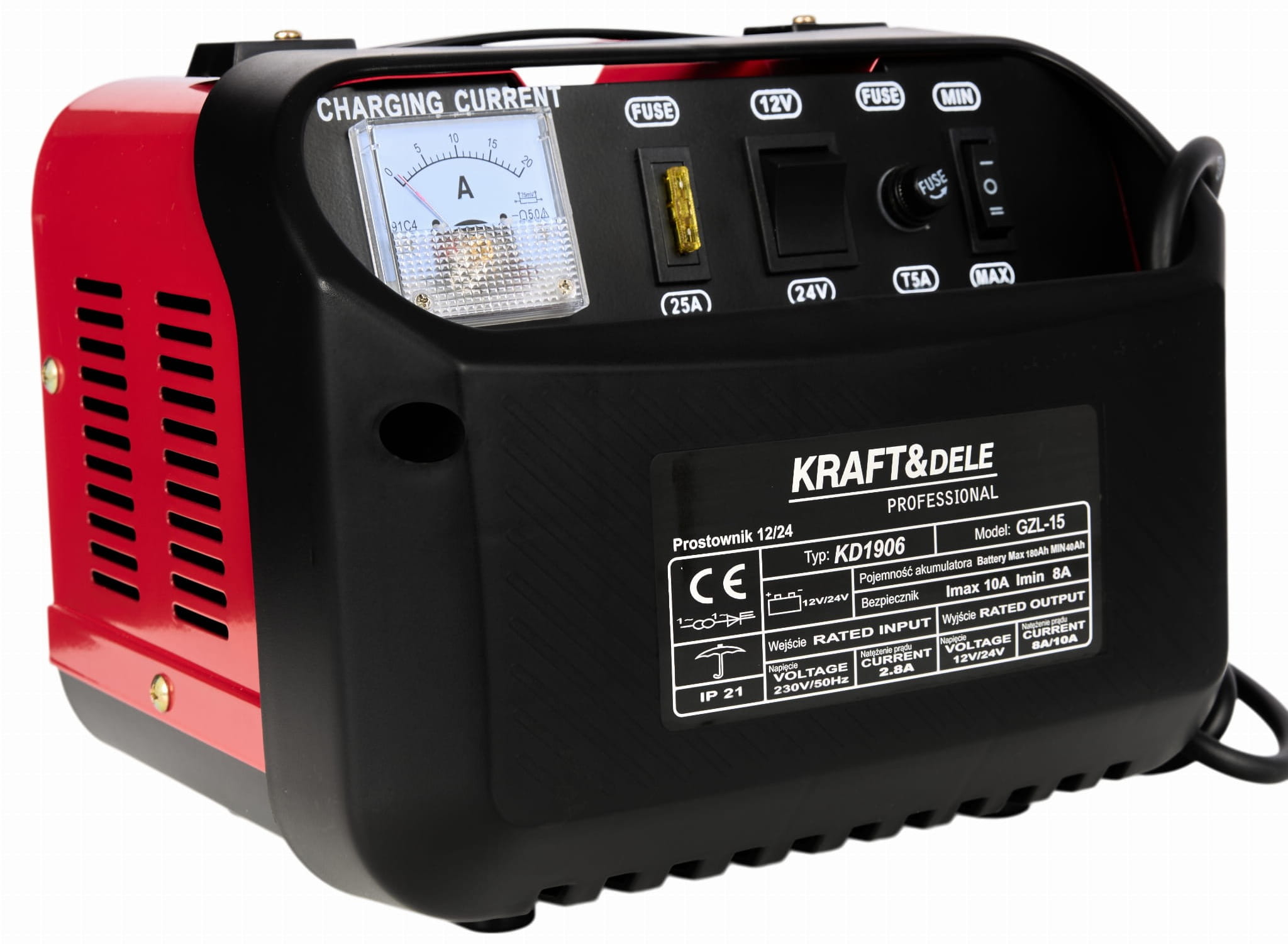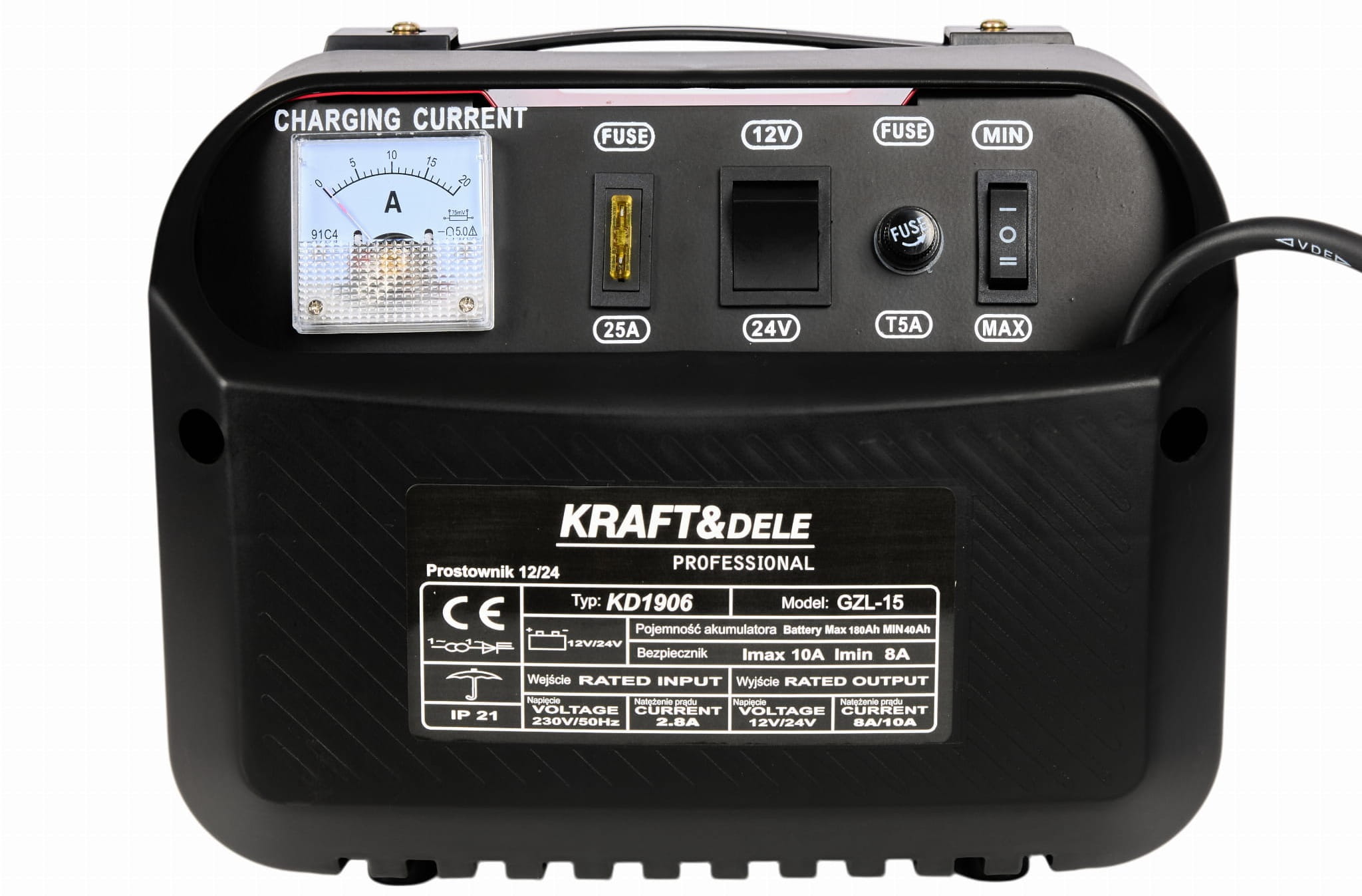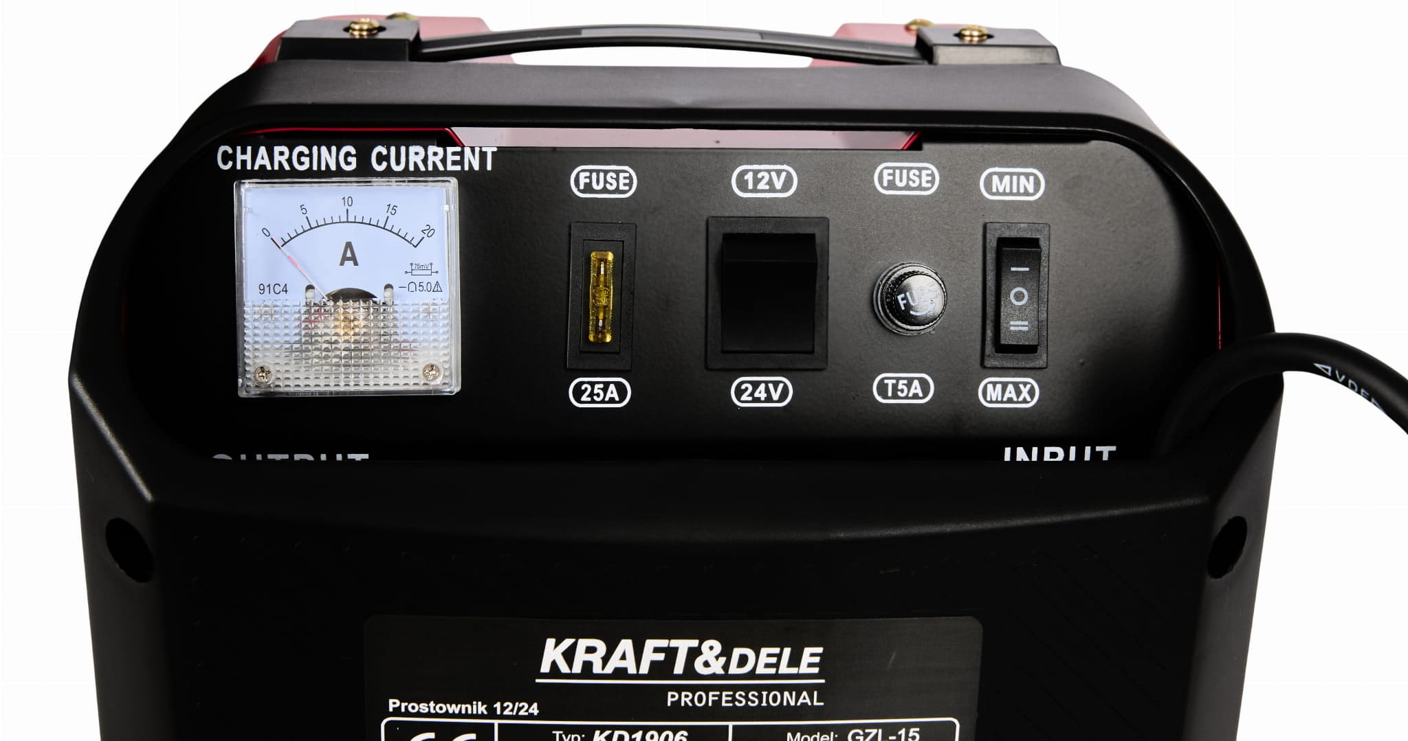 KD1906 to prostownik do ładowania akumulatorów kwasowo-ołowiowych o pojemności od 35 do 150 Ah, obsługujący instalacje zarówno 12V (osobowe, motocykle, quady), jak i 24V (pojazdy ciężarowe, maszyny robocze). Urządzenie zasilane z sieci 230V przeznaczone jest do użytku garażowego i warsztatowego.