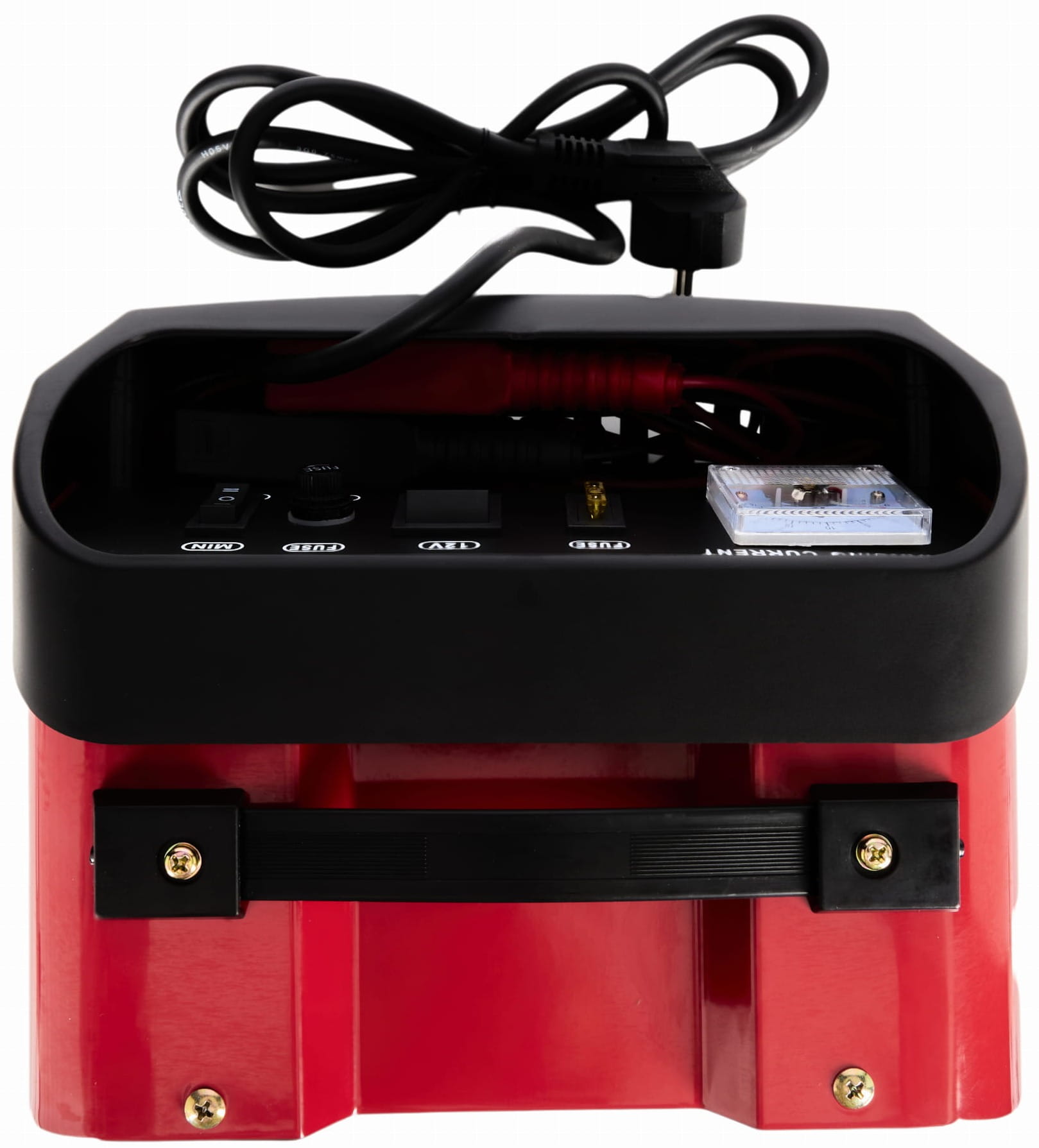 Wbudowany amperomierz wskazuje bieżącą wartość prądu ładowania. Pozwala obserwować przebieg procesu — w miarę ładowania akumulatora prąd stopniowo maleje, co jest sygnałem zbliżającego się naładowania. Umożliwia to świadome zakończenie ładowania bez ryzyka przeładowania.