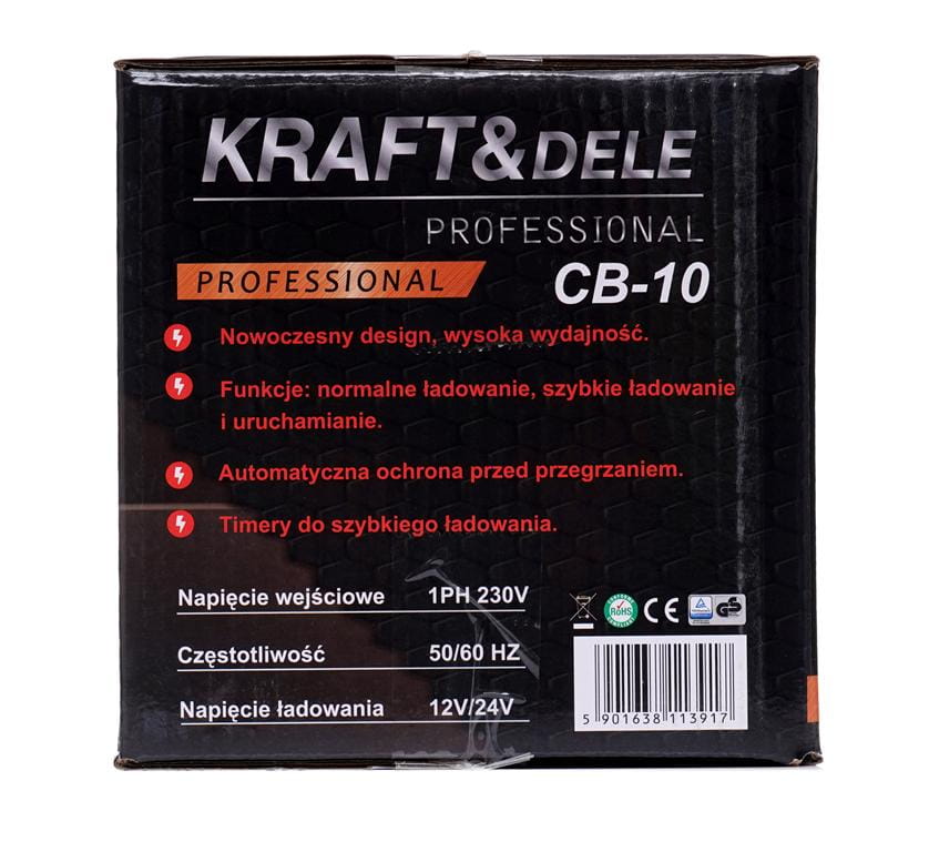 KD1905 to sieciowy prostownik do ładowania akumulatorów kwasowo-ołowiowych stosowanych w samochodach osobowych, dostawczych i maszynach roboczych. Obsługuje układy 12 V i 24 V przy prądzie ładowania do 10 A, co pozwala na naładowanie akumulatorów o pojemności od 20 Ah do 60 Ah. Urządzenie pracuje bezpośrednio z sieci 230 V i nie wymaga dodatkowego wyposażenia — kompletny zestaw z zaciskami i bezpiecznikami zapasowymi jest dołączony w pudełku.