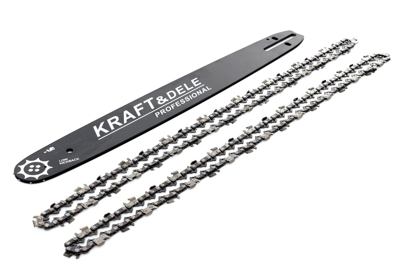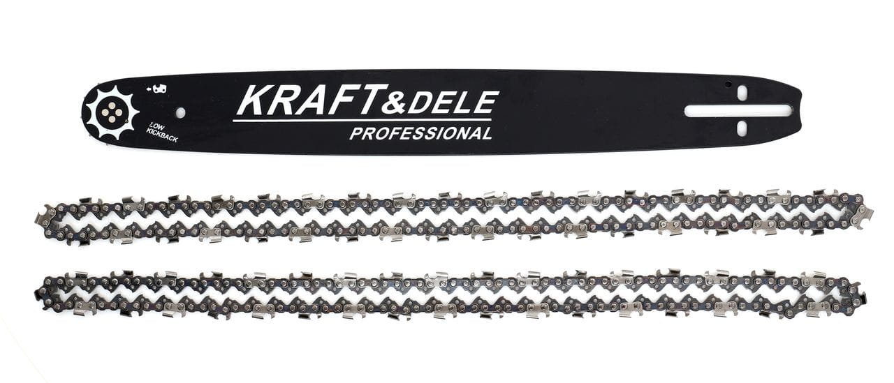 Zestaw zawiera prowadnicę o długości 45 cm oraz dwa łańcuchy tnące z podziałką 3/8 i grubością ogniwa prowadzącego 1,5 mm. Parametry zestawu odpowiadają standardowi stosowanemu w piłach łańcuchowych klasy średniej i profesjonalnej wielu czołowych producentów.