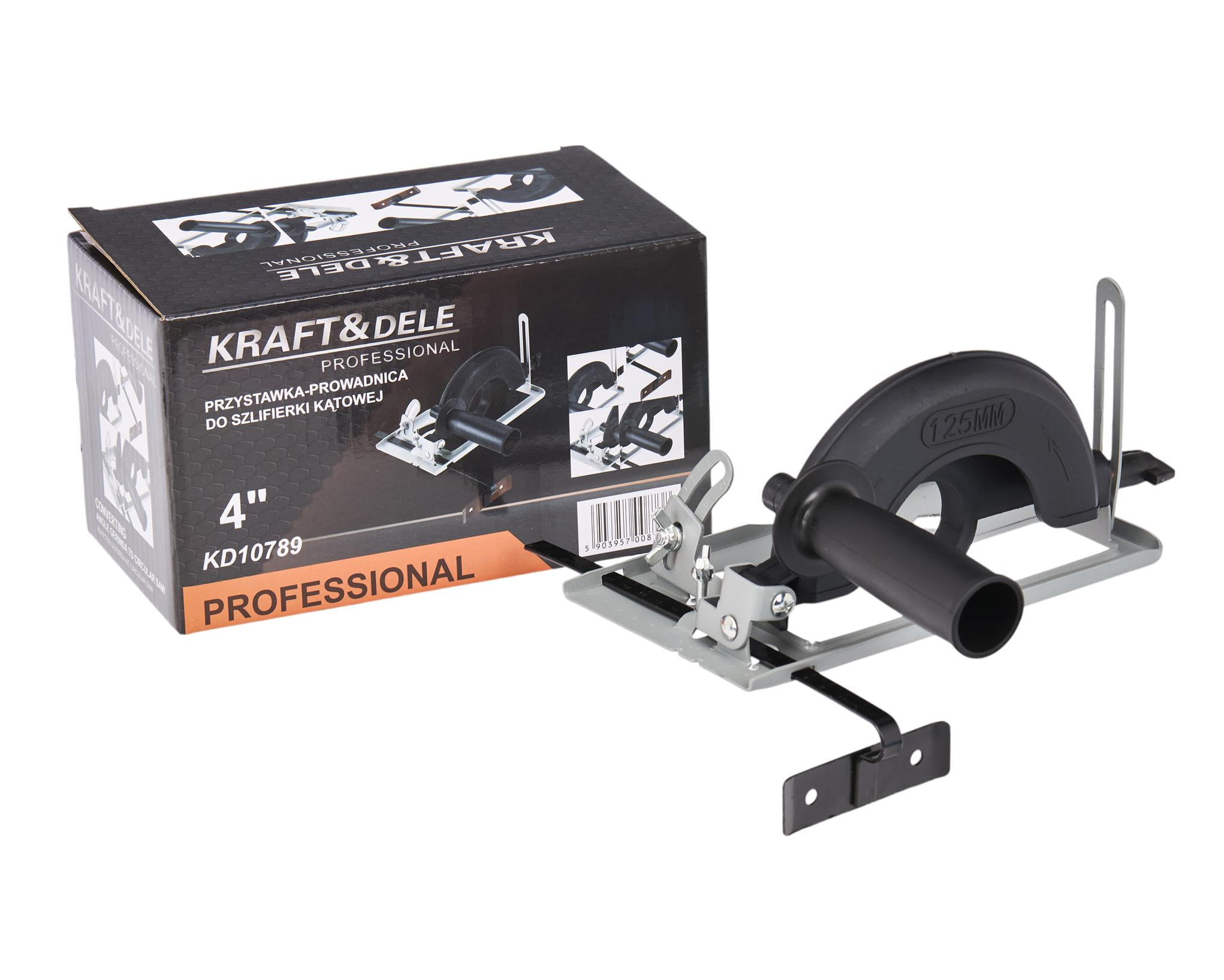 KD10789 to przystawka prowadząca do szlifierek kątowych o tarczach 115 i 125 mm (4"). Nakładka montowana na korpus szlifierki stabilizuje narzędzie podczas pracy, co przekłada się na większą powtarzalność cięć i szlifowania — zarówno na rozległych płaskich powierzchniach, jak i przy wycinaniu elementów o nieregularnych kształtach.