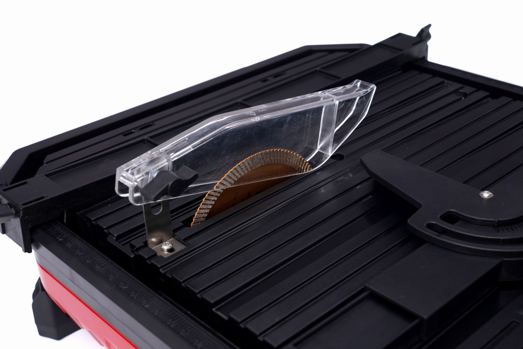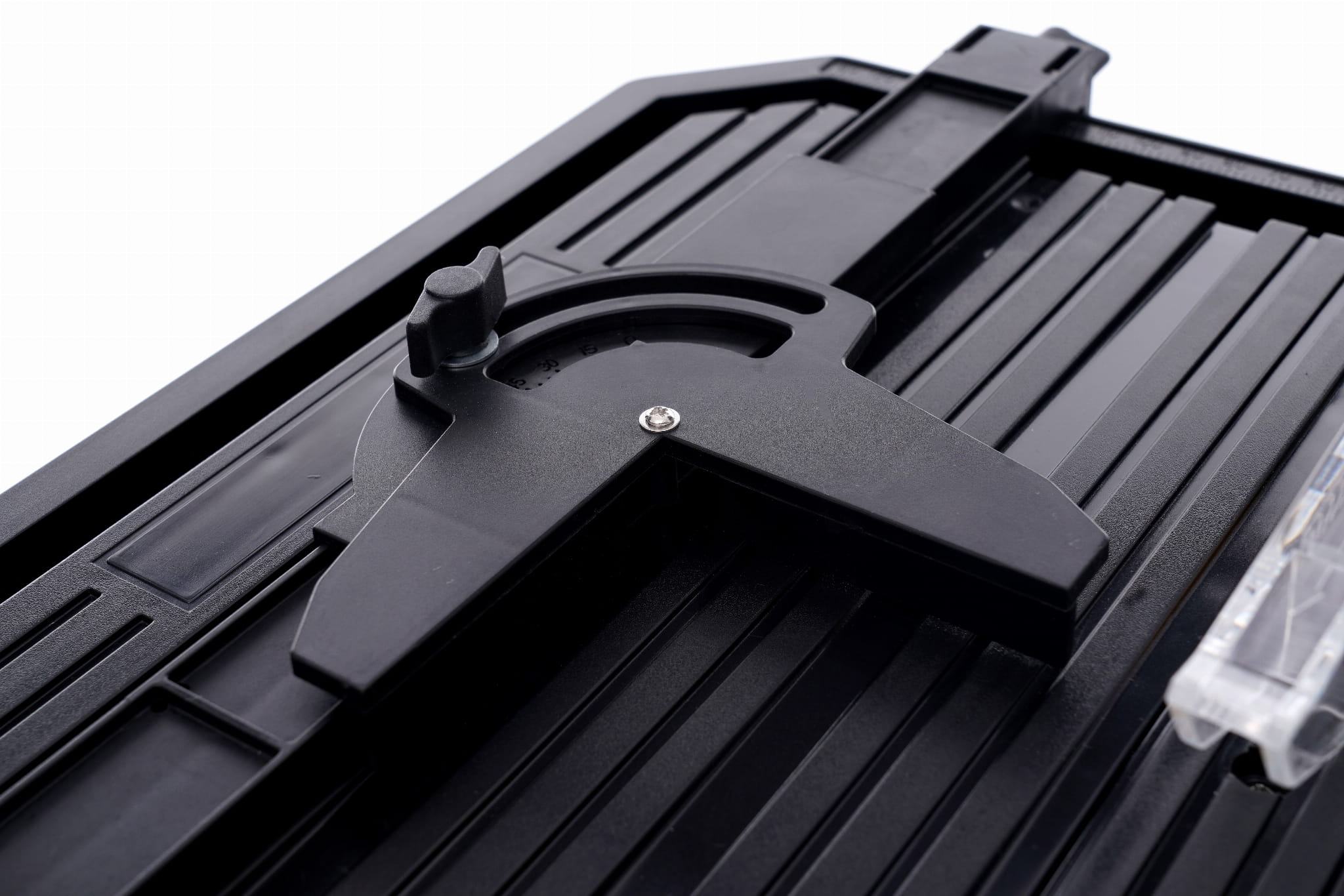 Stalowy blat o wymiarach 365 × 390 mm zapewnia stabilne podparcie dla ciętego materiału. Powierzchnia ta pozwala na swobodne prowadzenie płytek o popularnych formatach bez ryzyka przechylenia podczas cięcia.