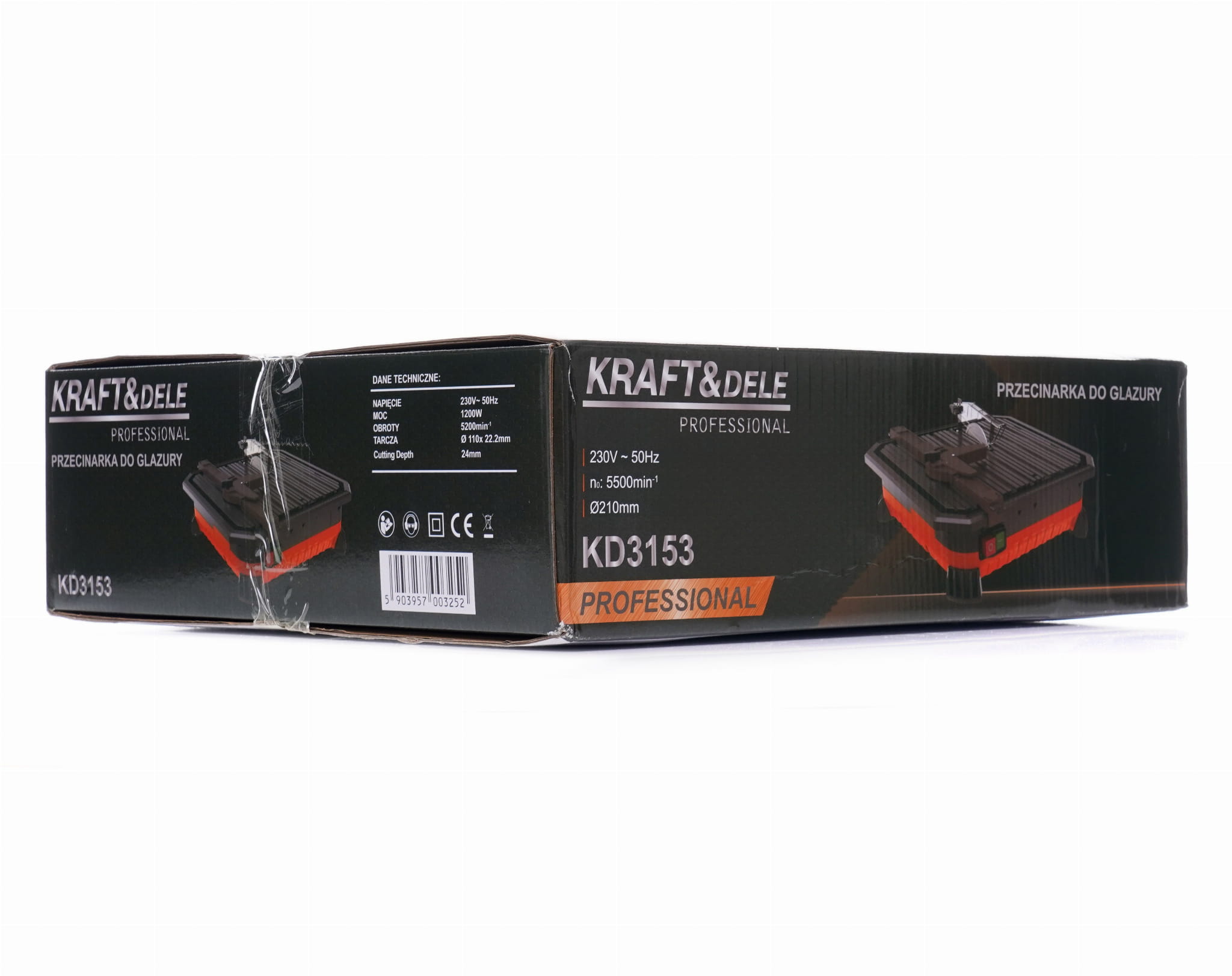 Przecinarka KD3153 pracuje z systemem mokrego cięcia — zbiornik na wodę chłodzi tarczę i ogranicza pylenie podczas pracy. Przed każdym użyciem należy sprawdzić poziom wody w zbiorniku oraz stan tarczy tnącej. Tarczę o wymiarach Ø110 × Ø22,2 mm można wymienić w przypadku zużycia — producent zapewnia dostęp do bazy części zamiennych.