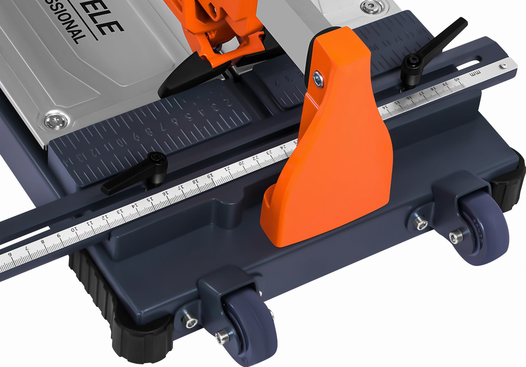 Ergonomiczny uchwyt umożliwia pewne prowadzenie głowicy tnącej wzdłuż prowadnicy. Dołączone kółka transportowe ułatwiają przemieszczanie urządzenia na budowie — istotne przy gabarytach narzędzia o długości ponad 1,6 m.