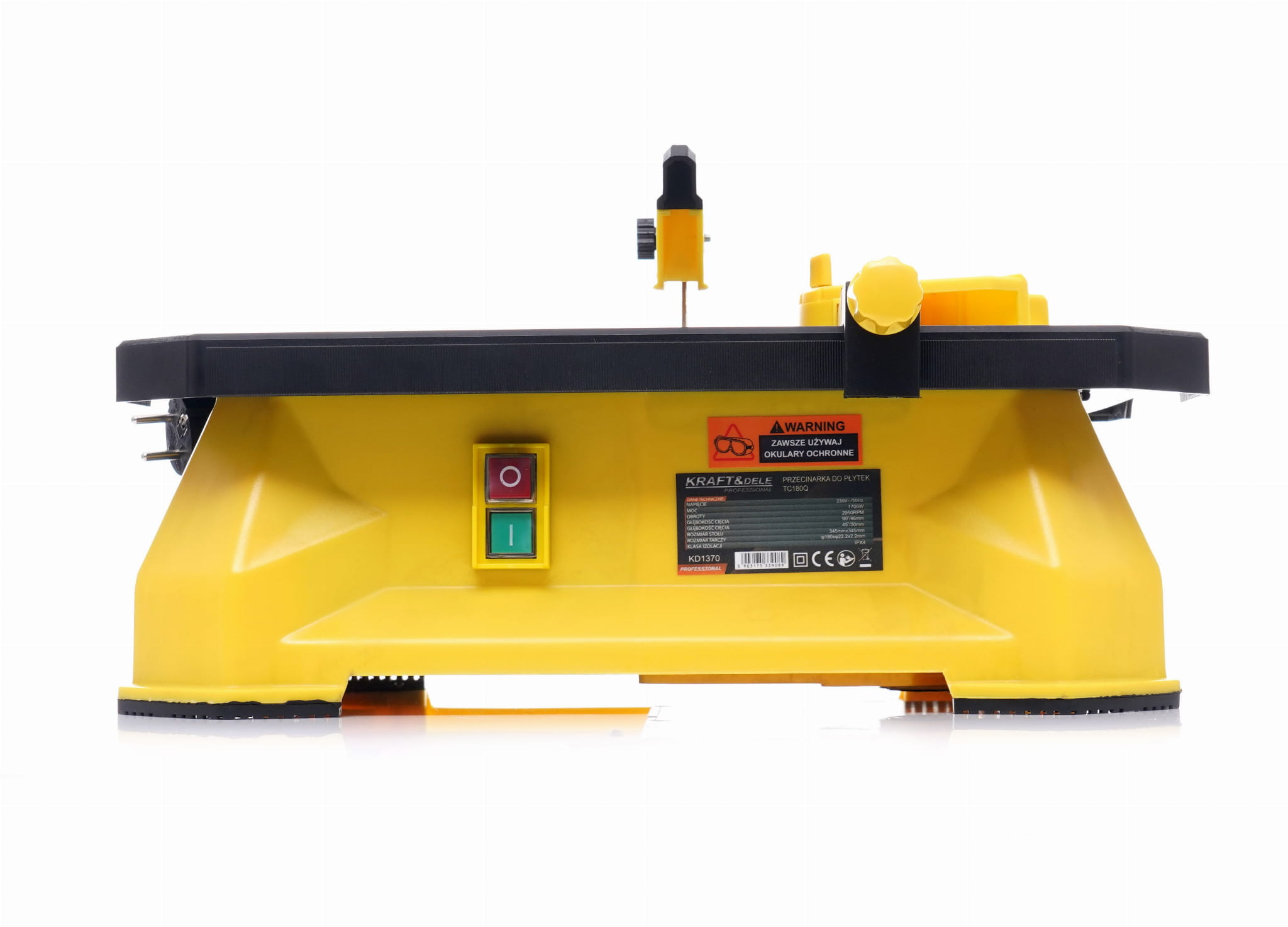 Przecinarka KD1370 pracuje z wodnym chłodzeniem tarczy — przed uruchomieniem należy uzupełnić zbiornik wodą, co zapobiega przegrzewaniu się tarczy diamentowej i wydłuża jej żywotność. Po zakończeniu pracy zaleca się opróżnienie zbiornika i osuszenie blatu roboczego, aby zapobiec osadzaniu się resztek materiału na powierzchni stalowej.